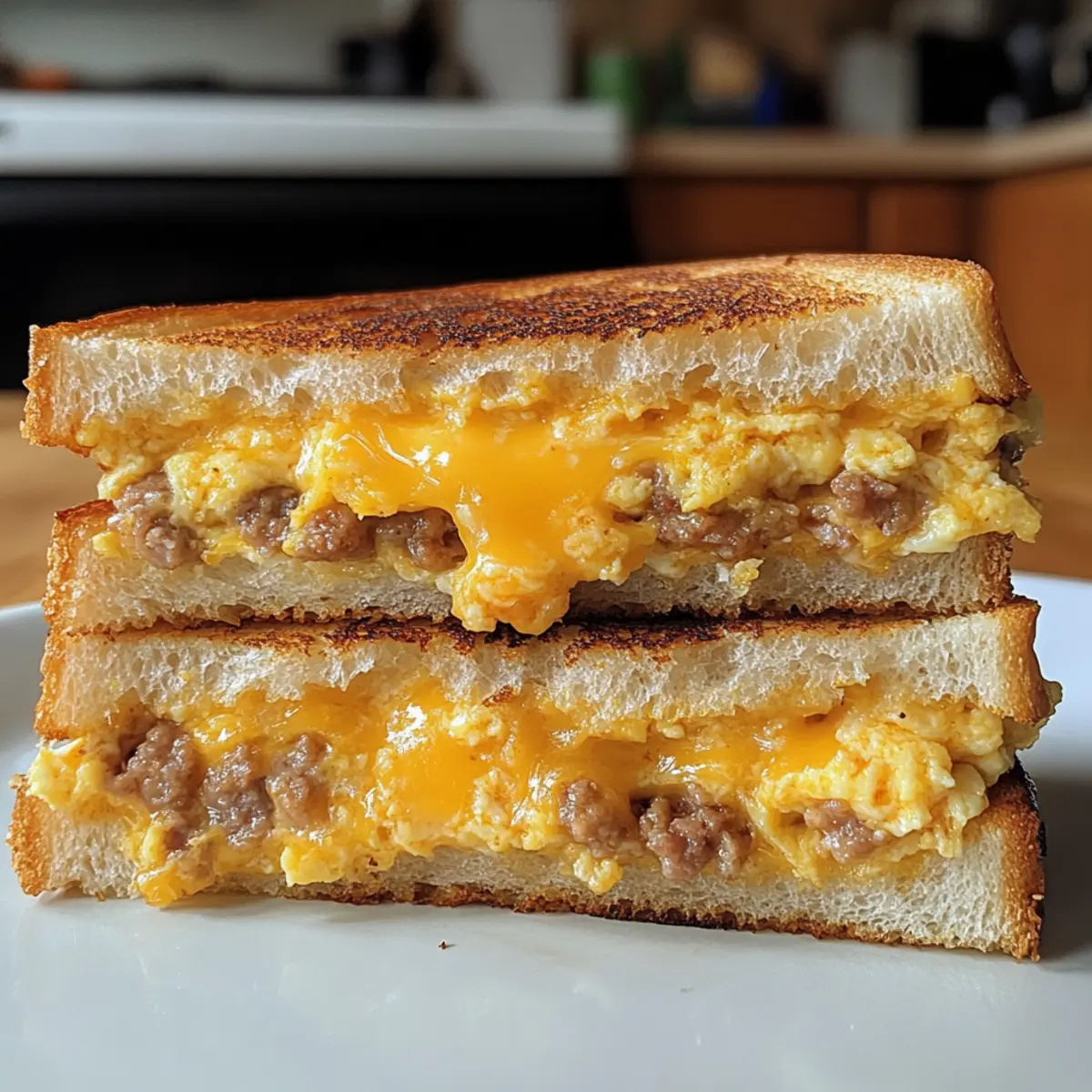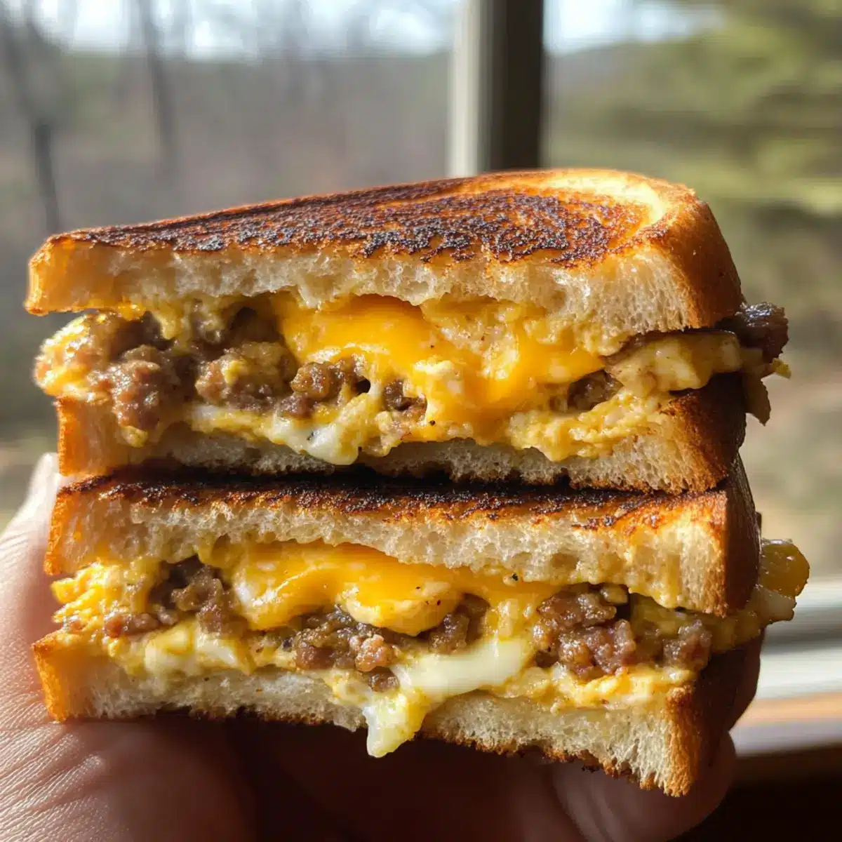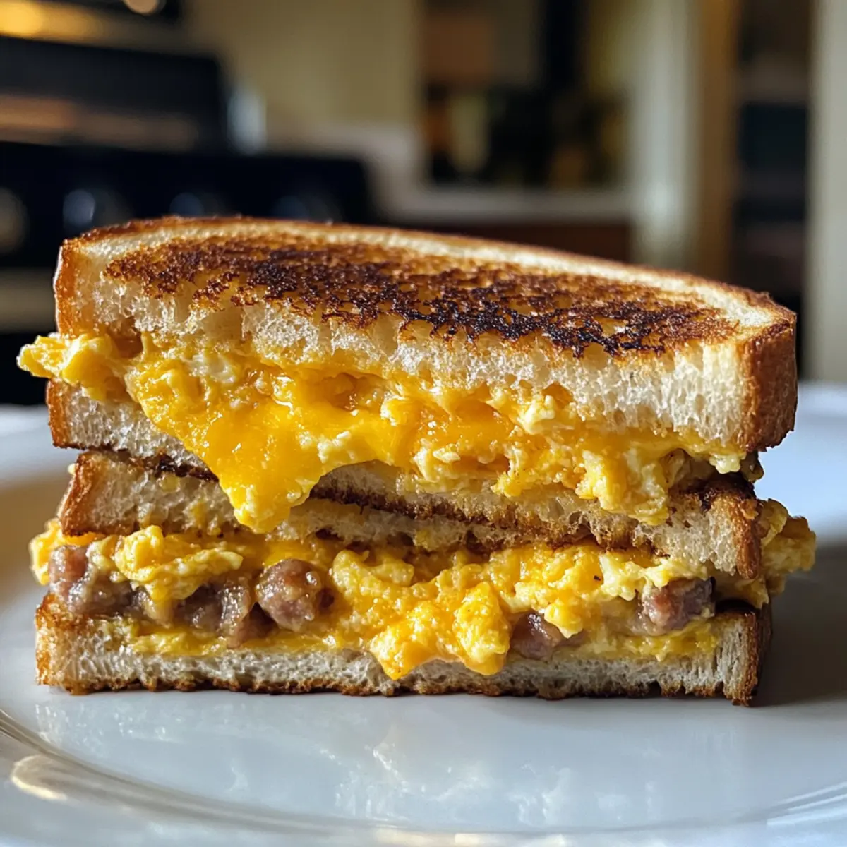 Butter one side of each slice of sourdough bread generously. In the skillet, place one slice butter-side down, and layer on a slice of cheese. Then, add about ½ cup of the egg and sausage mixture, topping it with another slice of cheese, and finish with another slice of bread, butter-side up.