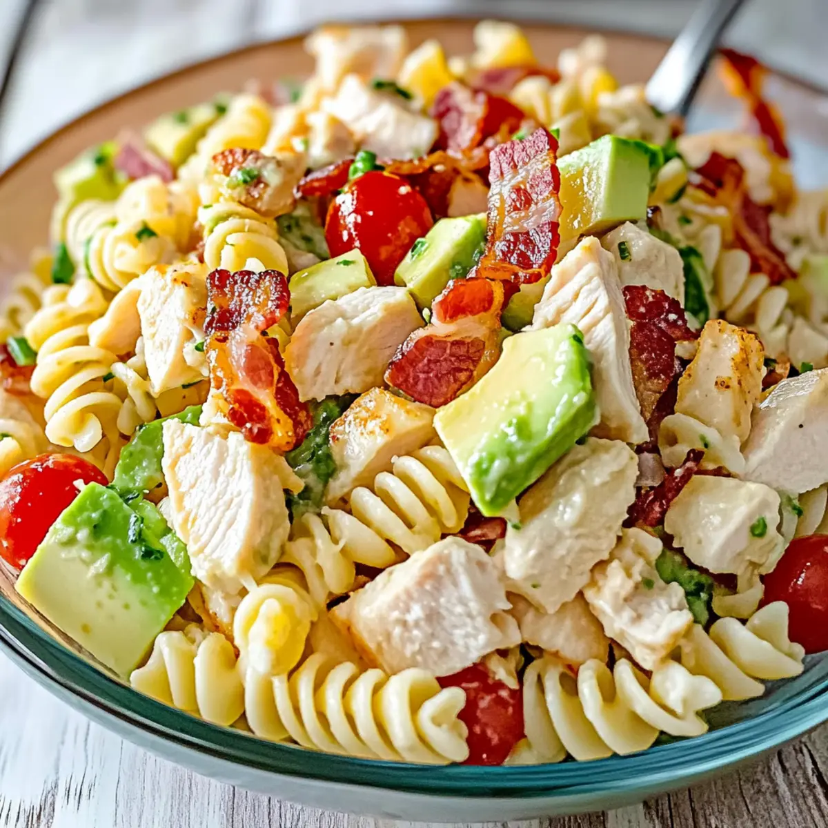 While Chicken Club Pasta Salad is best enjoyed fresh, you can freeze it for up to 2 months! To do this, assemble the salad without the avocado and dressing. Once cooled, place the salad in a freezer-safe container and seal it tightly. When you’re ready to enjoy it again, thaw it in the fridge overnight and add fresh avocado and dressing just before serving for optimal taste.