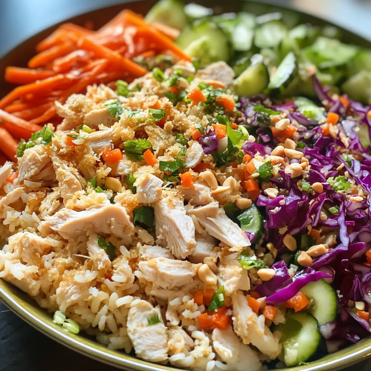 - Combine Ingredients: In a large bowl, fold together crispy rice, chicken, cabbage, carrots, cucumber, green onions, and cilantro.
