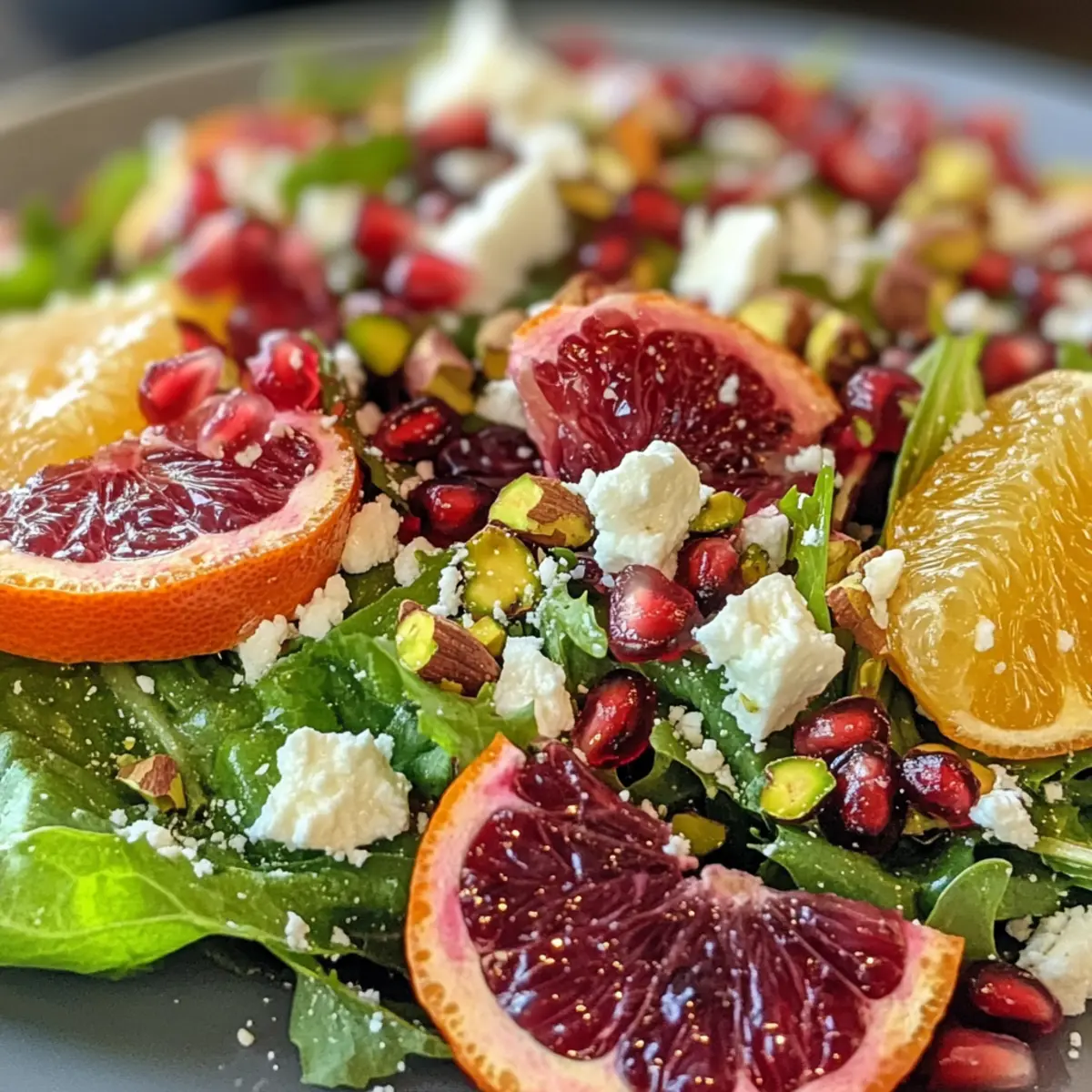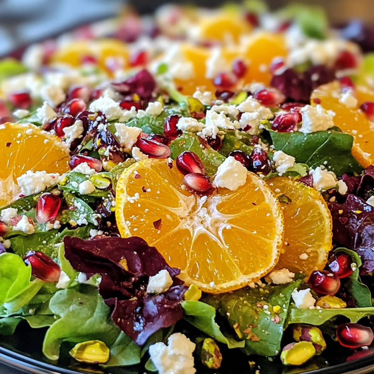 - Layer the mixed greens with slices of navel orange, arranging like festive wreaths. Sprinkle fresh pomegranate arils over the top.
