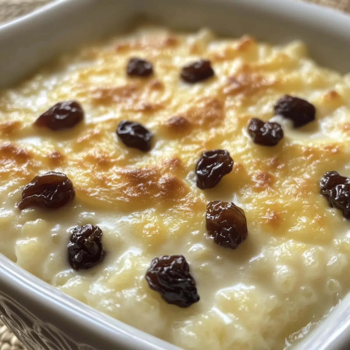- Spread the cooked rice in the greased baking dish, sprinkle with raisins, and pour the custard mixture over it, stirring lightly to combine.