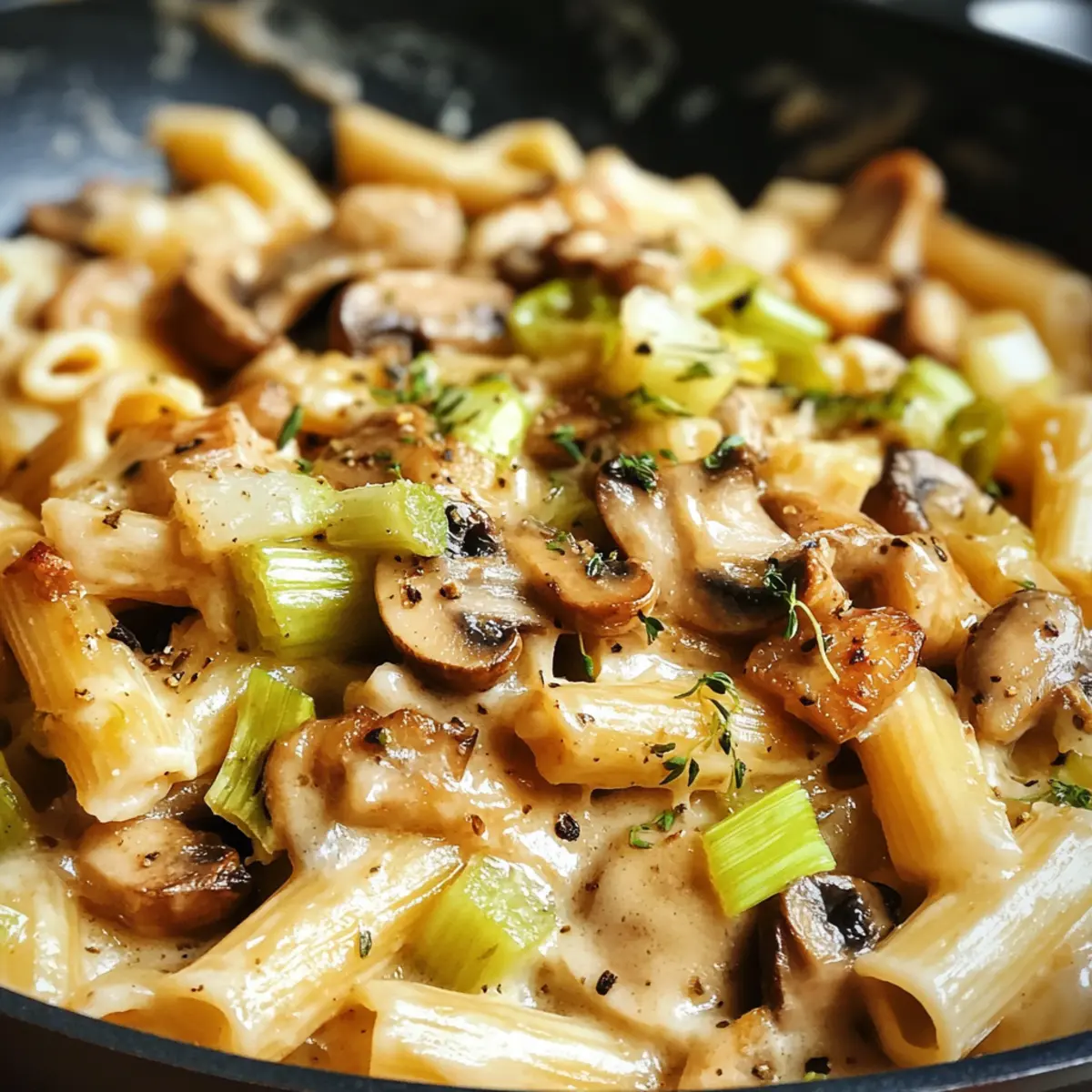 In a large skillet, melt 2 tablespoons of unsalted butter along with 2 tablespoons of olive oil over medium heat. Add 2 large sliced leeks and gently cook them for about 12 to 15 minutes. Stir occasionally until the leeks are golden brown and caramelized, releasing their sweet aroma that sets a comforting tone for your Creamy Mushroom Gruyere Pasta.