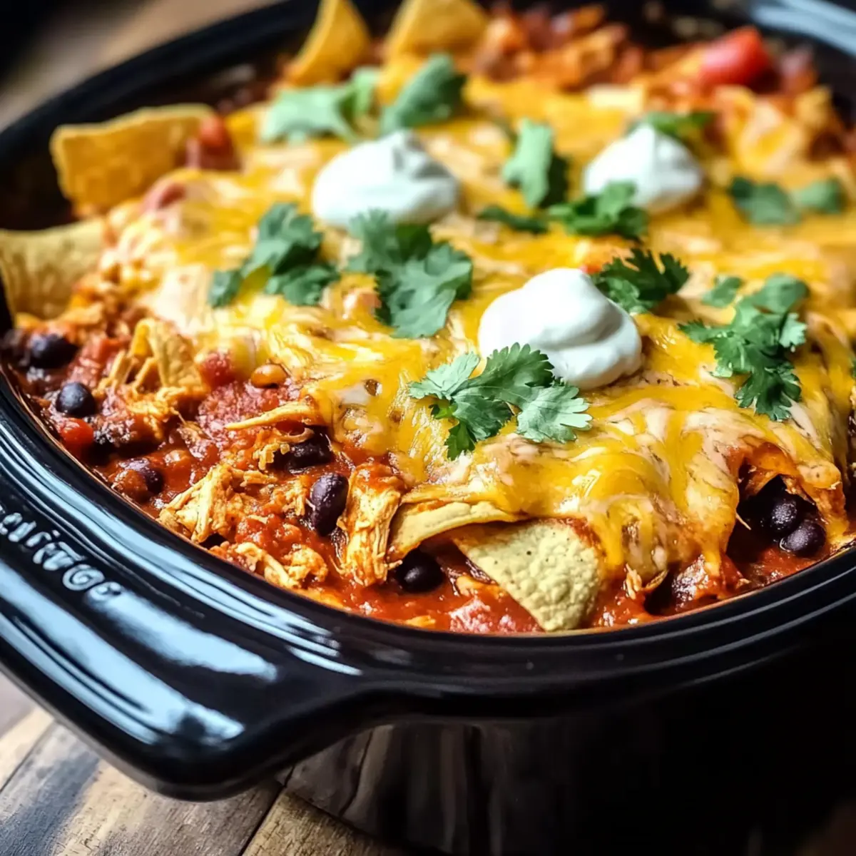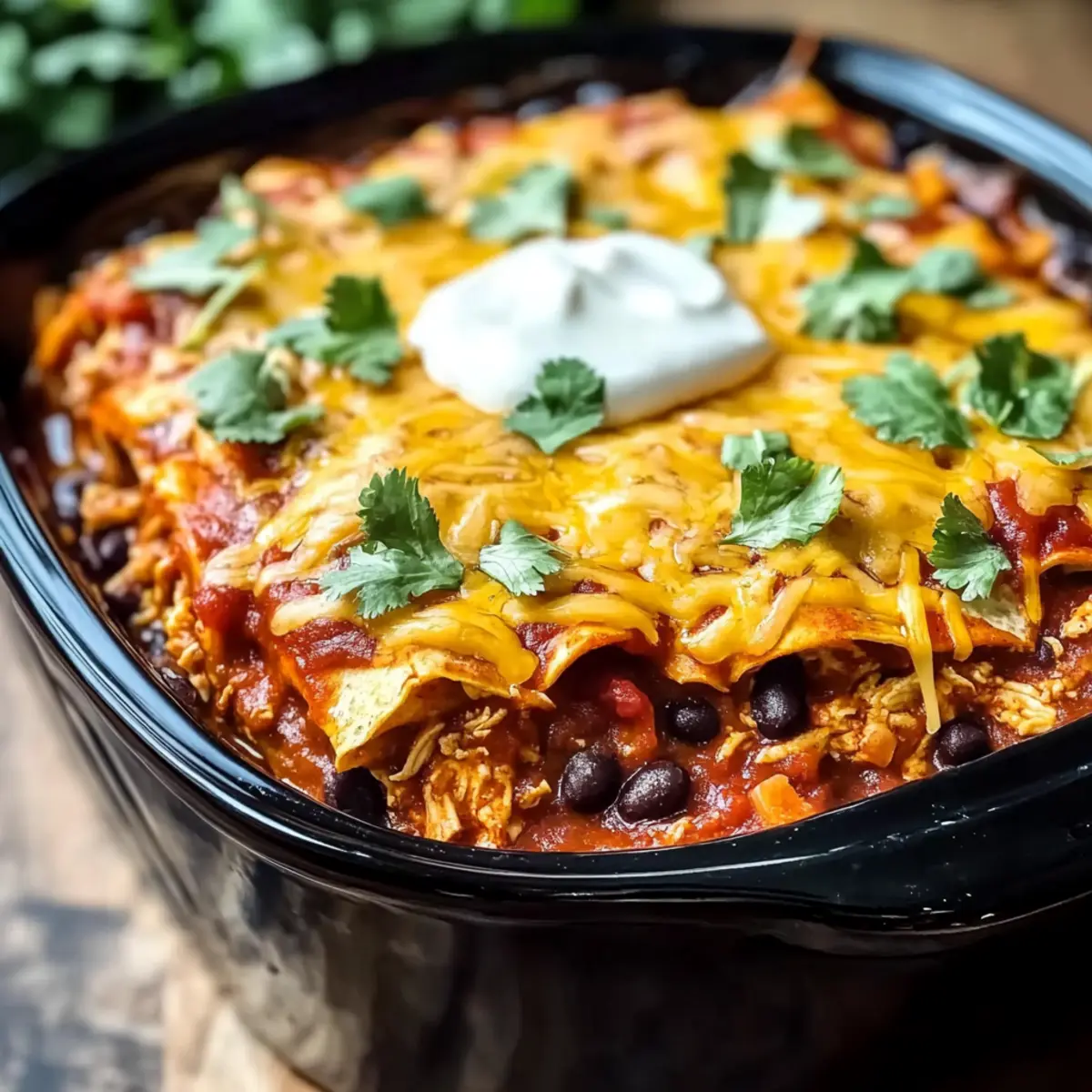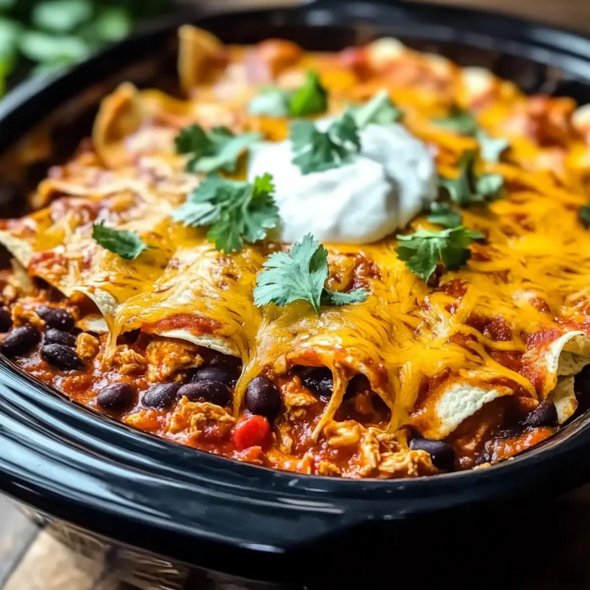 - Layer the Ingredients: Pour enchilada sauce over the chicken, then add tortillas, beans, and cheese.