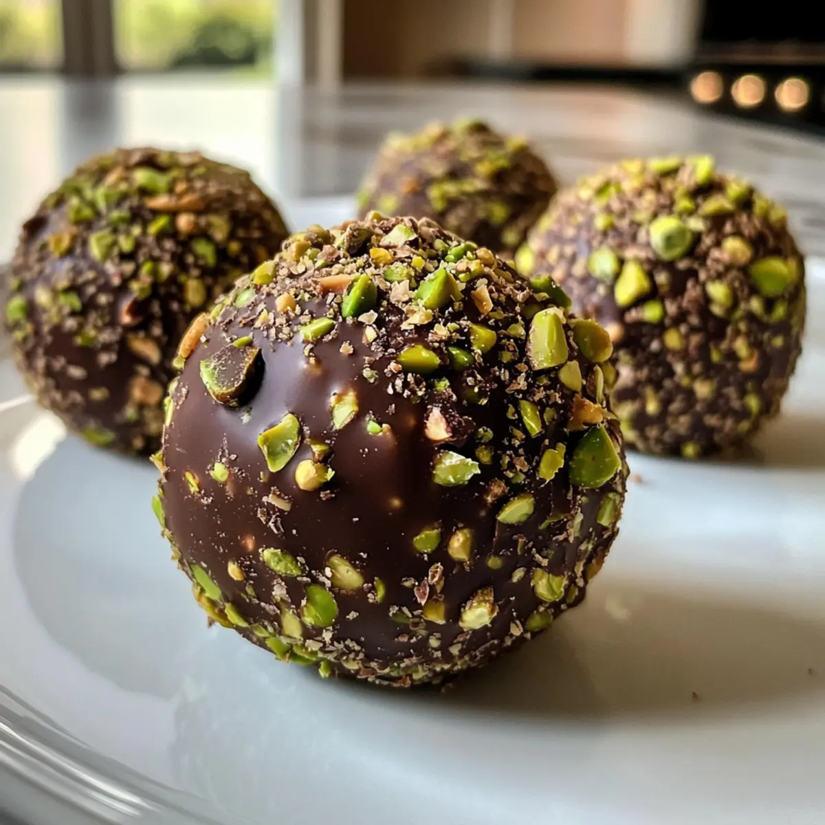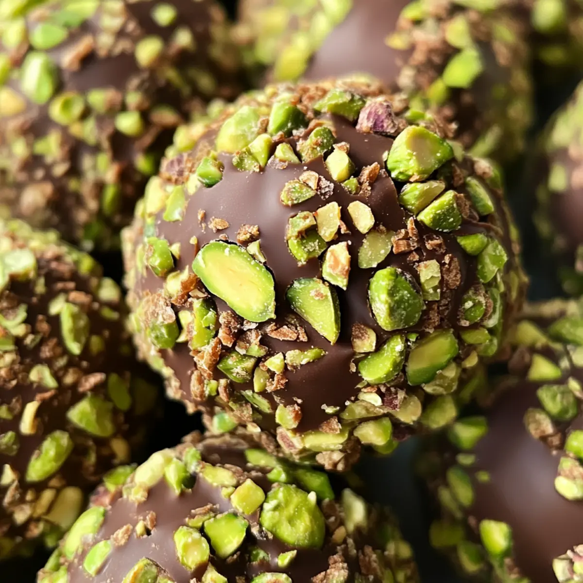 - Melt dark chocolate and temper it. Dip chilled balls into melted chocolate, allowing excess to drip off, and sprinkle with chopped pistachios.
