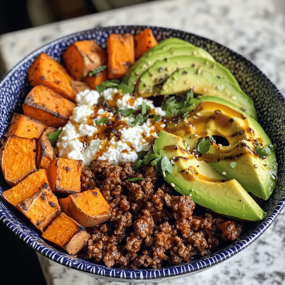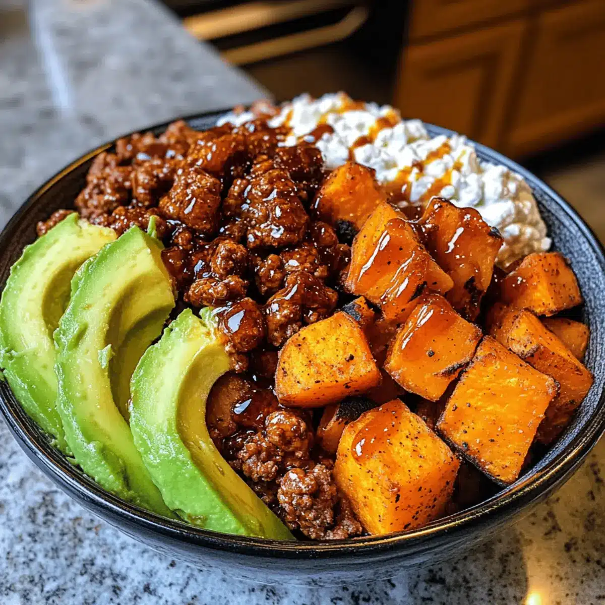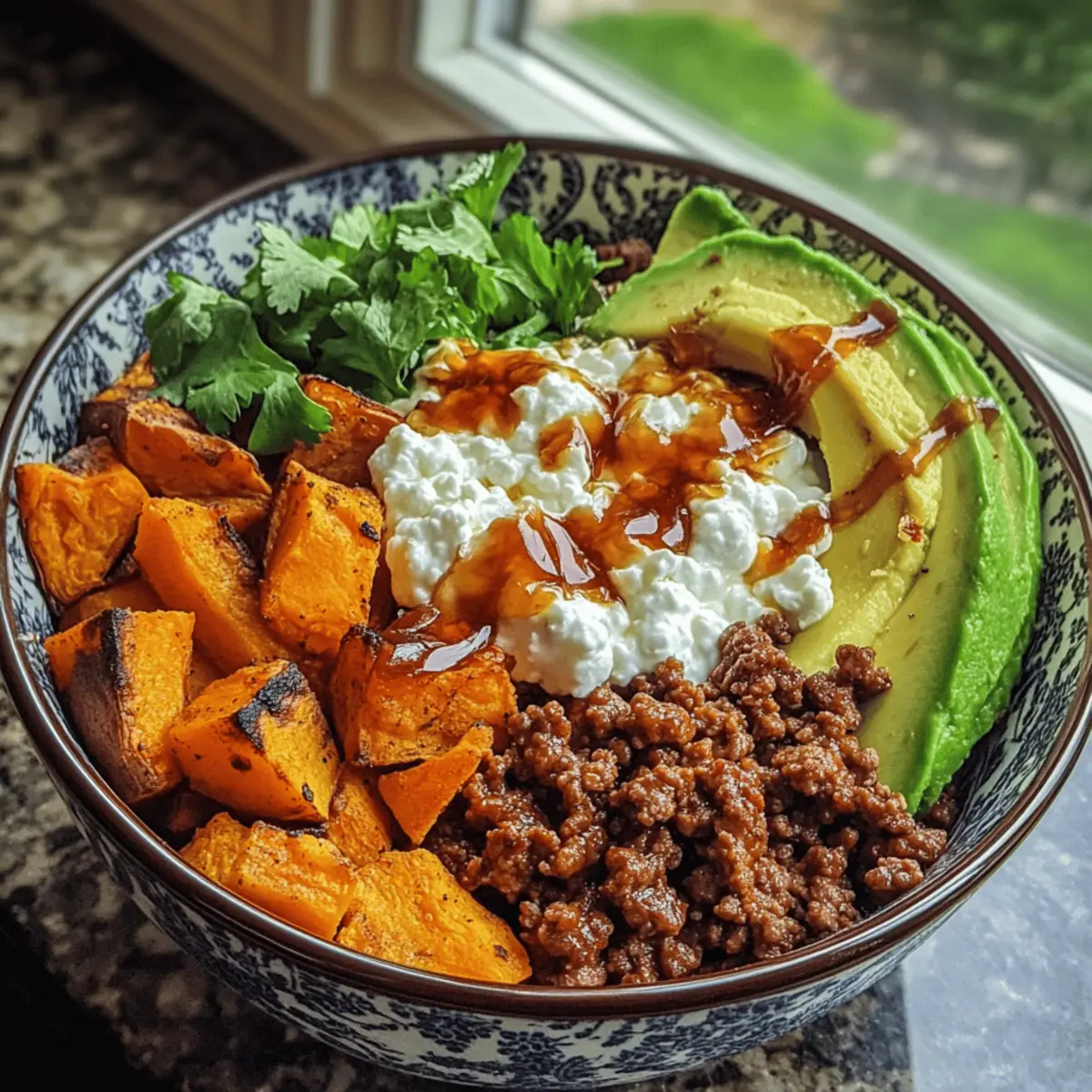 - Assemble the Bowls: Layer roasted sweet potatoes, ground beef, cottage cheese, and fresh avocado in serving bowls.