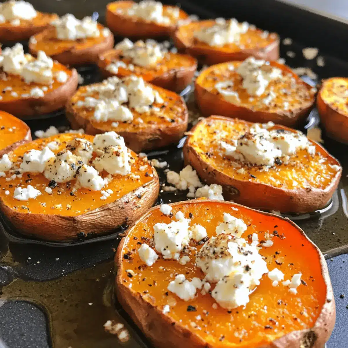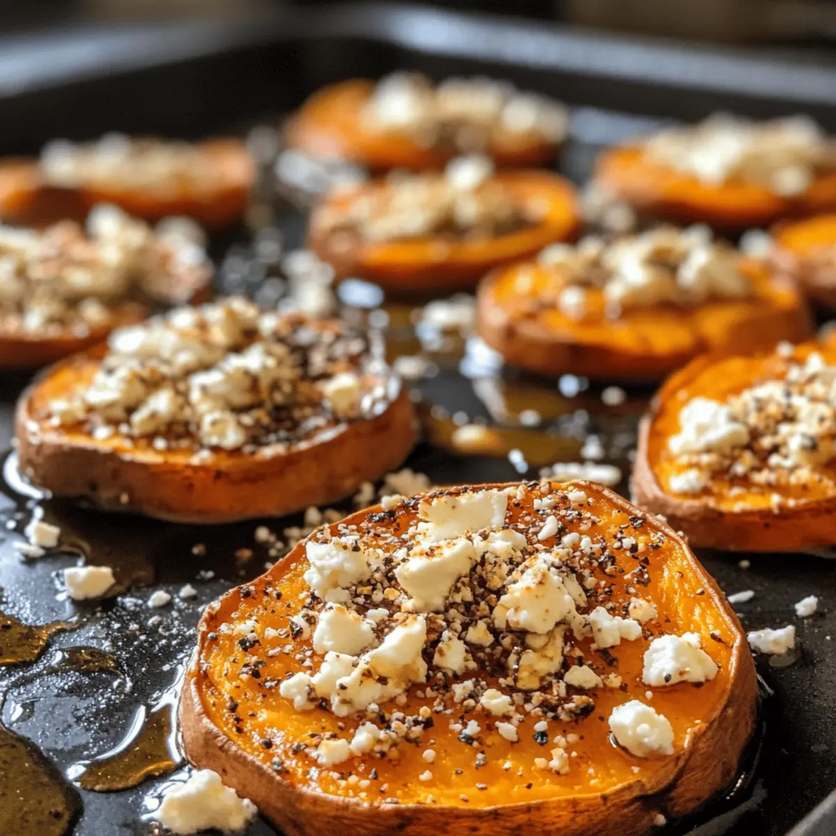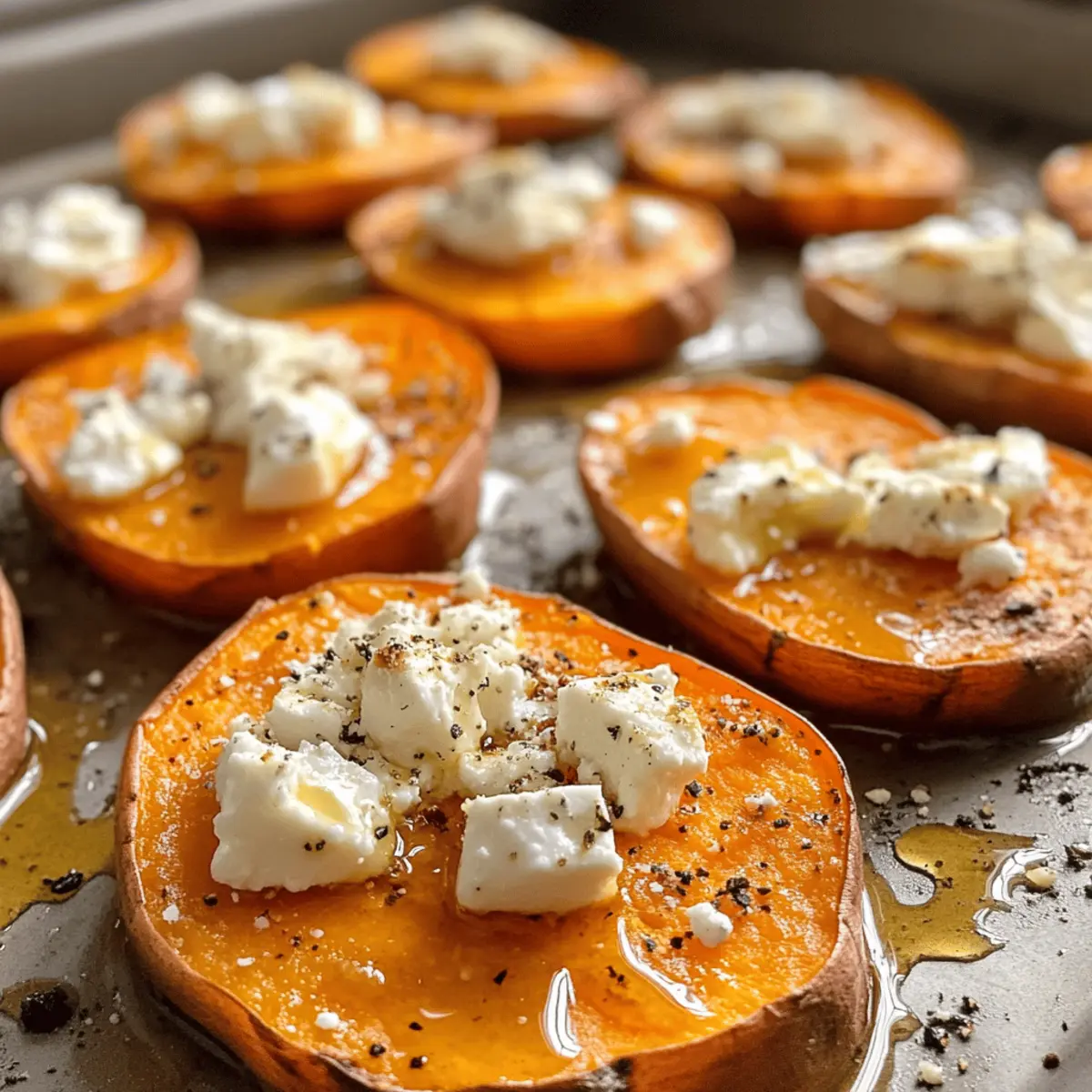 - Sprinkle crumbled feta cheese generously over the warm sweet potato rounds.