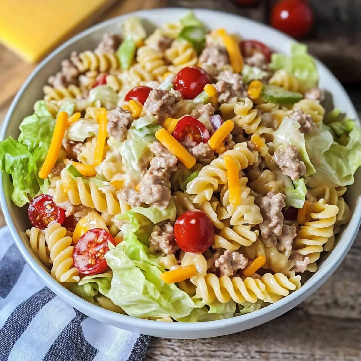 - In the bowl with the cooled rotini pasta, add the meat mixture along with diced cherry tomatoes, sliced red onion, chopped pickles, shredded lettuce, and cheddar cheese. Mix gently until well-distributed.