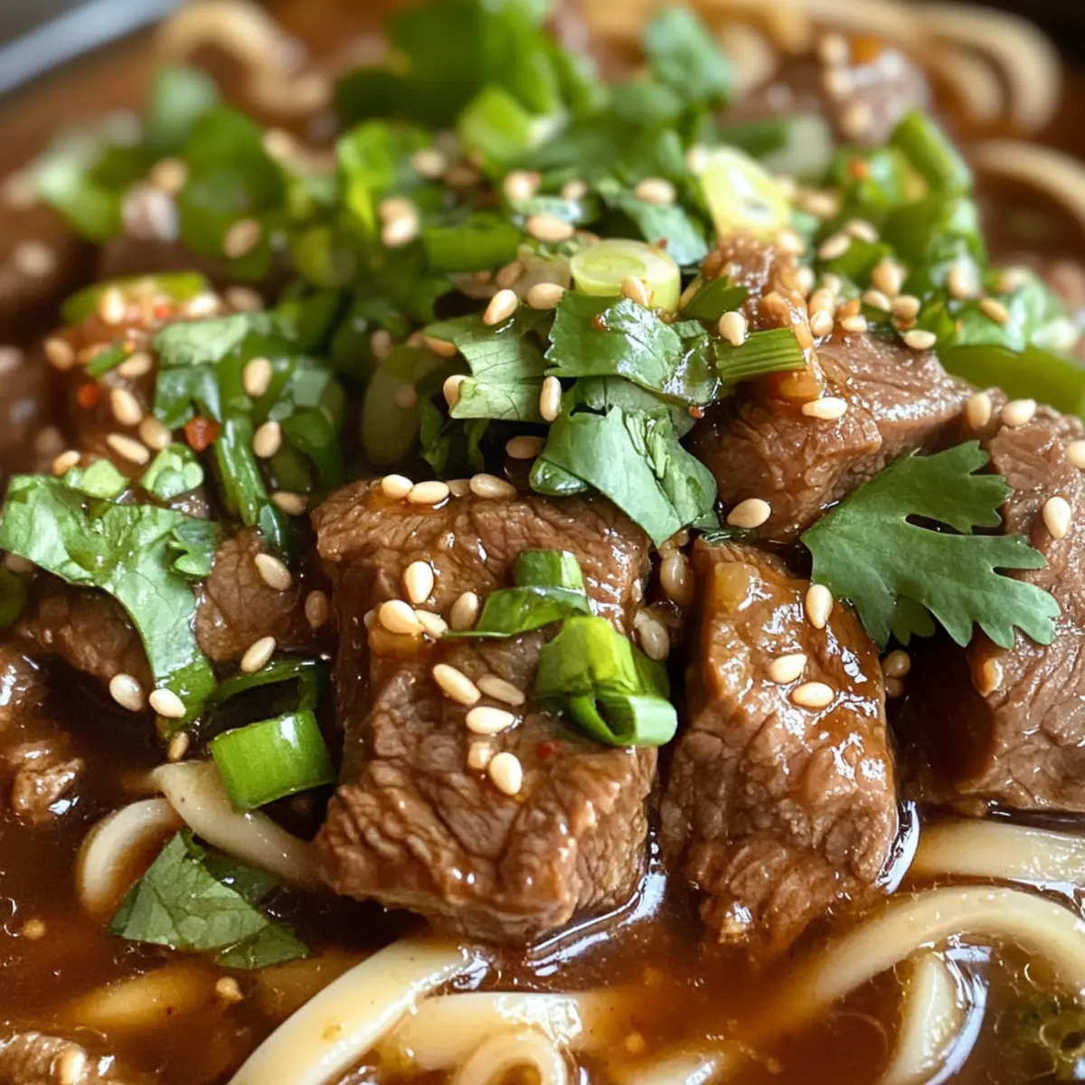 Ladle the hearty Korean Beef Noodles into bowls, ensuring each serving has an abundance of beef and broth. Garnish with sliced green onions, a sprinkle of sesame seeds, and fresh cilantro for an added burst of freshness and crunch. Enjoy your comforting bowl of warmth that embodies the essence of home-cooked bliss!