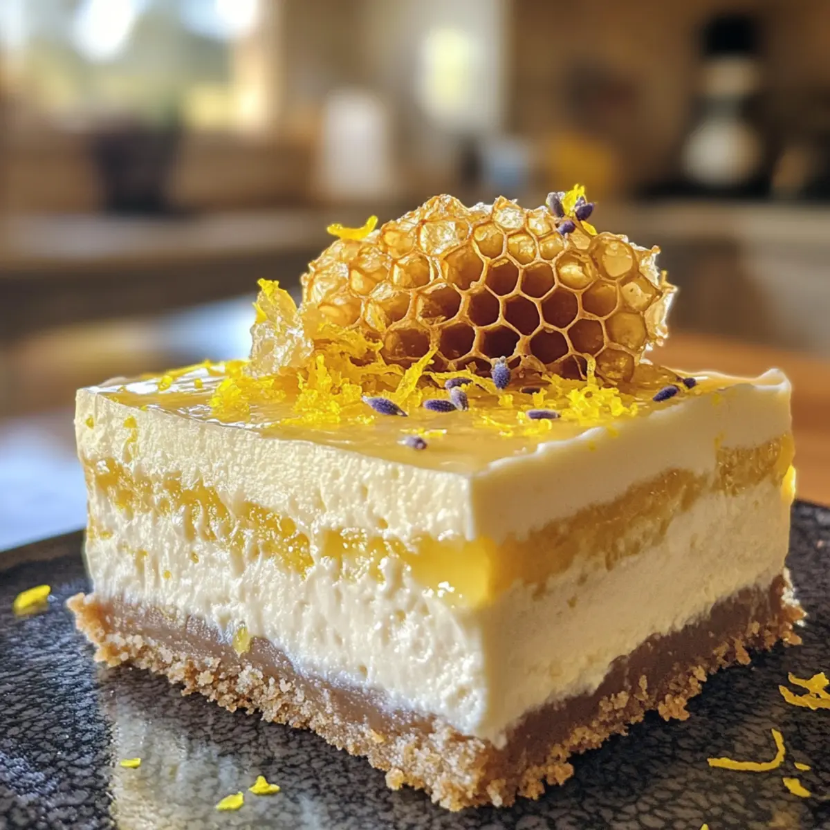 - Remove the cheesecake from the springform pan, top with honeycomb, and drizzle with honey or agave. Sprinkle with lavender buds and lemon zest before serving.