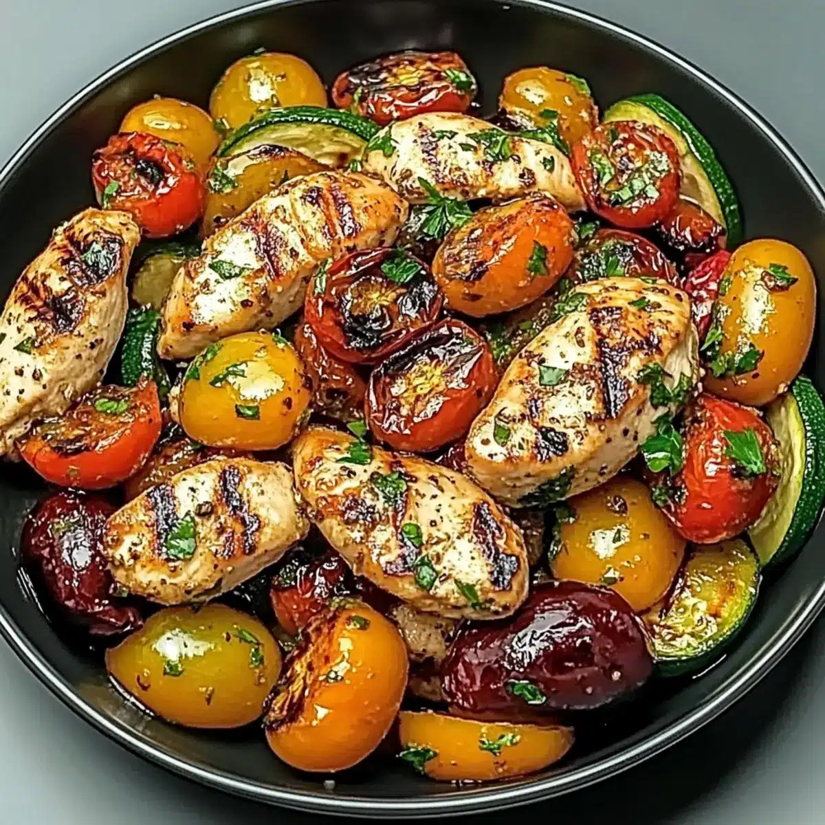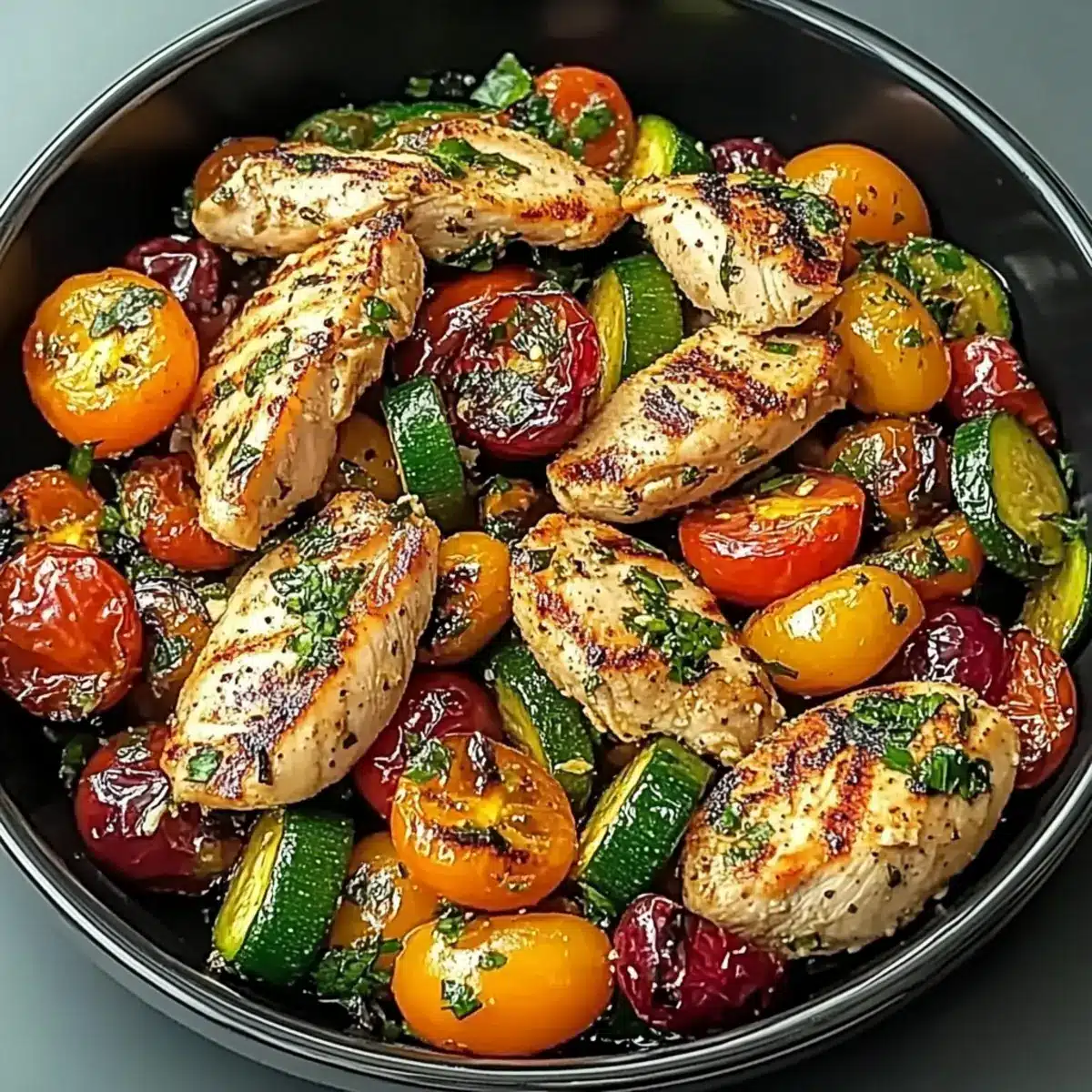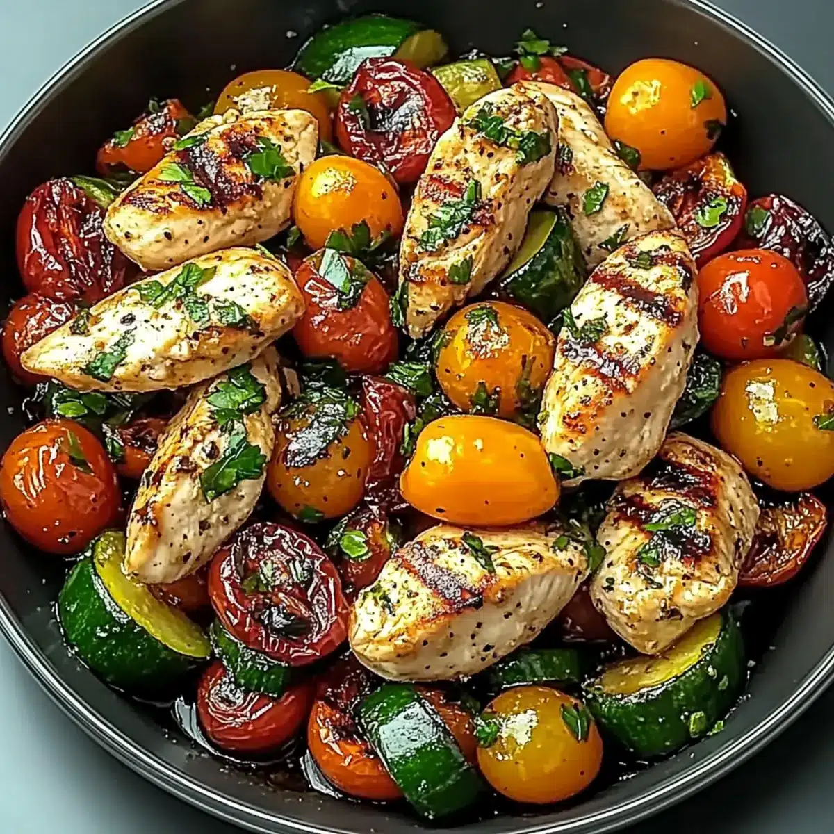 Once the chicken is cooked, push it to one side of the pan to create space. Add minced garlic to the empty side, cooking for about 30 seconds until fragrant. Then, add the sliced bell peppers, zucchini, and halved cherry tomatoes to the pan. Stir-fry the mixture for 5-7 minutes, ensuring the vegetables remain tender yet crisp.