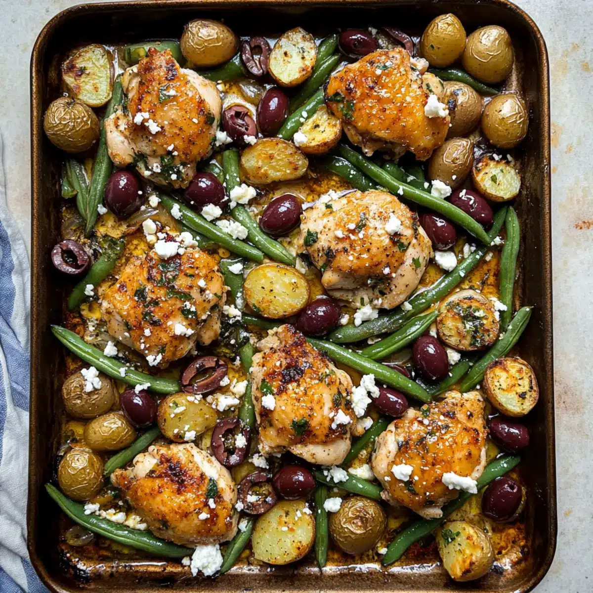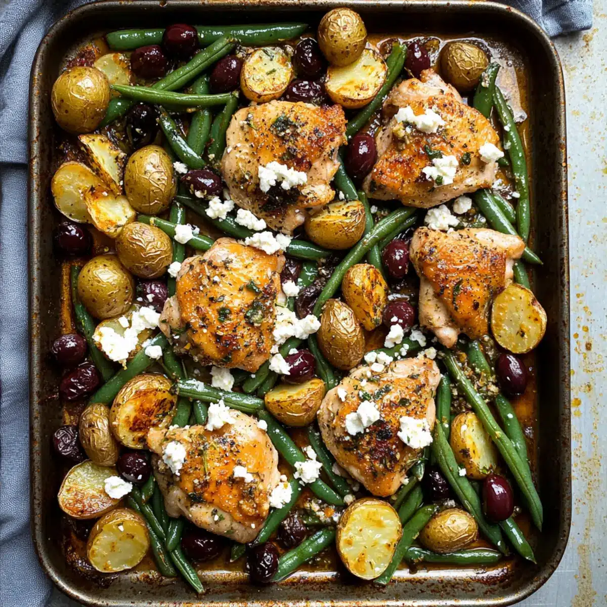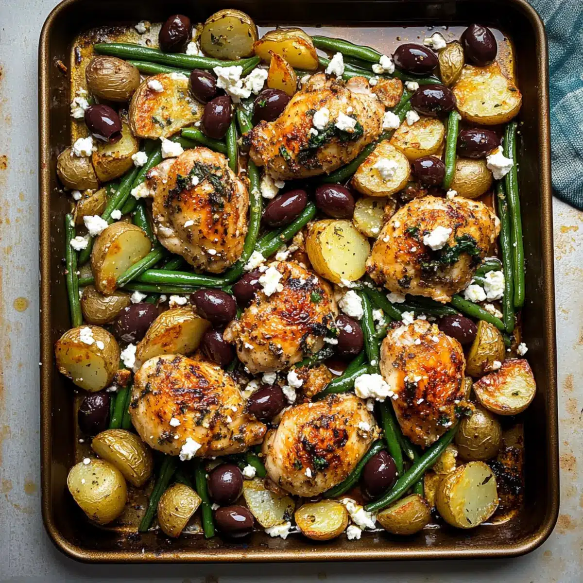 - Add fresh green beans around the chicken and potatoes, drizzle with olive oil, and scatter olives on top.