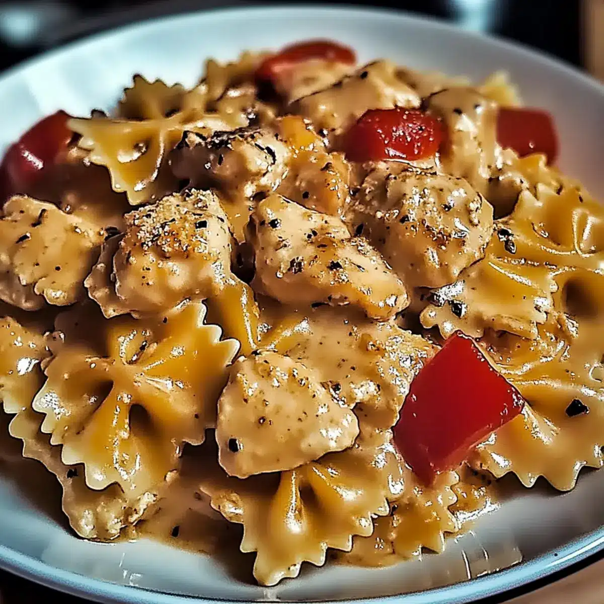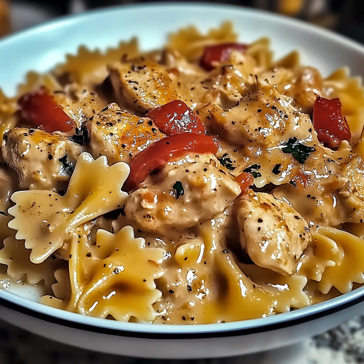 Return the seared chicken to the skillet along with the drained bowtie pasta. Toss everything together gently until the pasta and chicken are well coated in the creamy sauce. If the sauce becomes too thick, thin it out using the reserved pasta water, adding a splash at a time until you achieve your desired consistency.