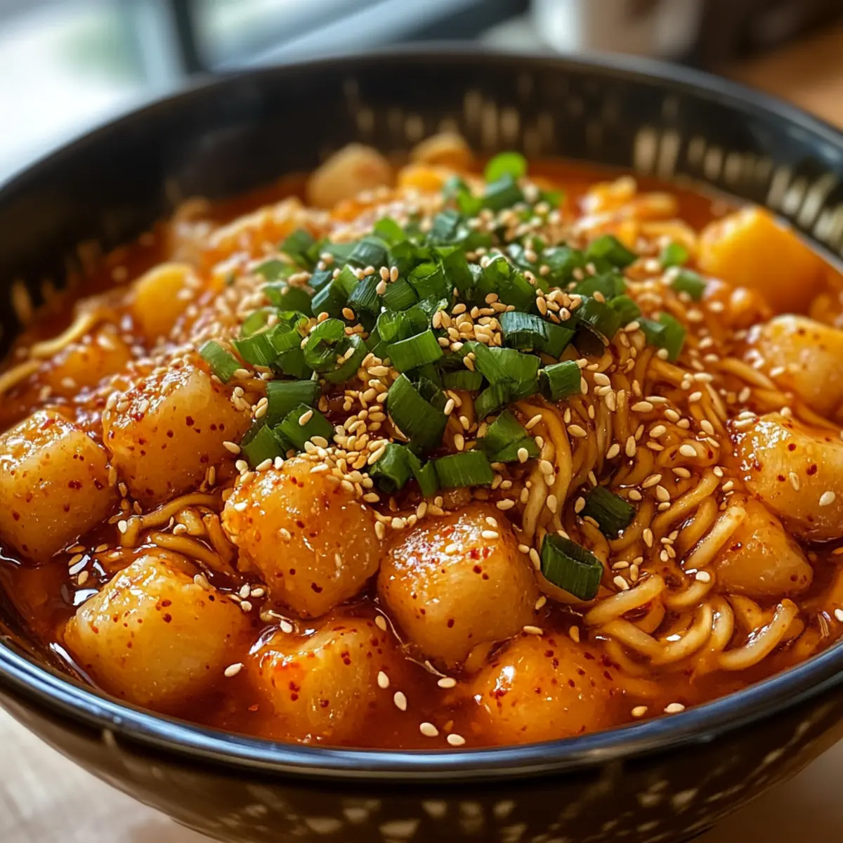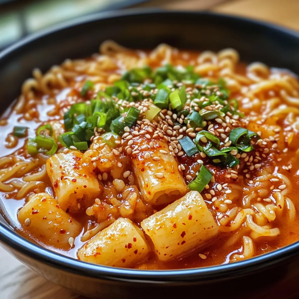 When everything is perfectly cooked, remove the pot from heat. Garnish your Rabokki with freshly chopped green onions and sprinkle some white sesame seeds on top for added crunch. The vibrant colors and inviting scents should be a feast for the eyes and nose alike!