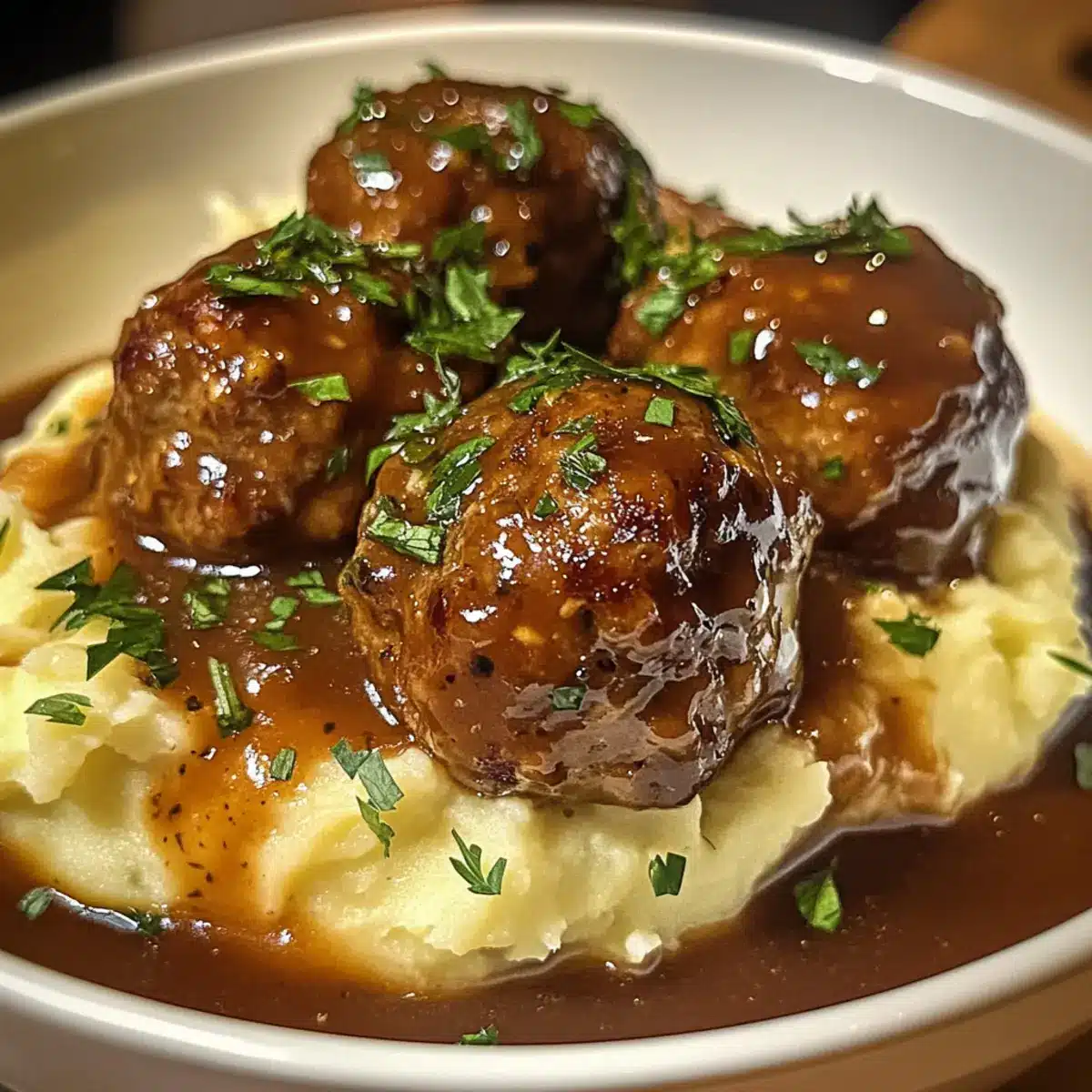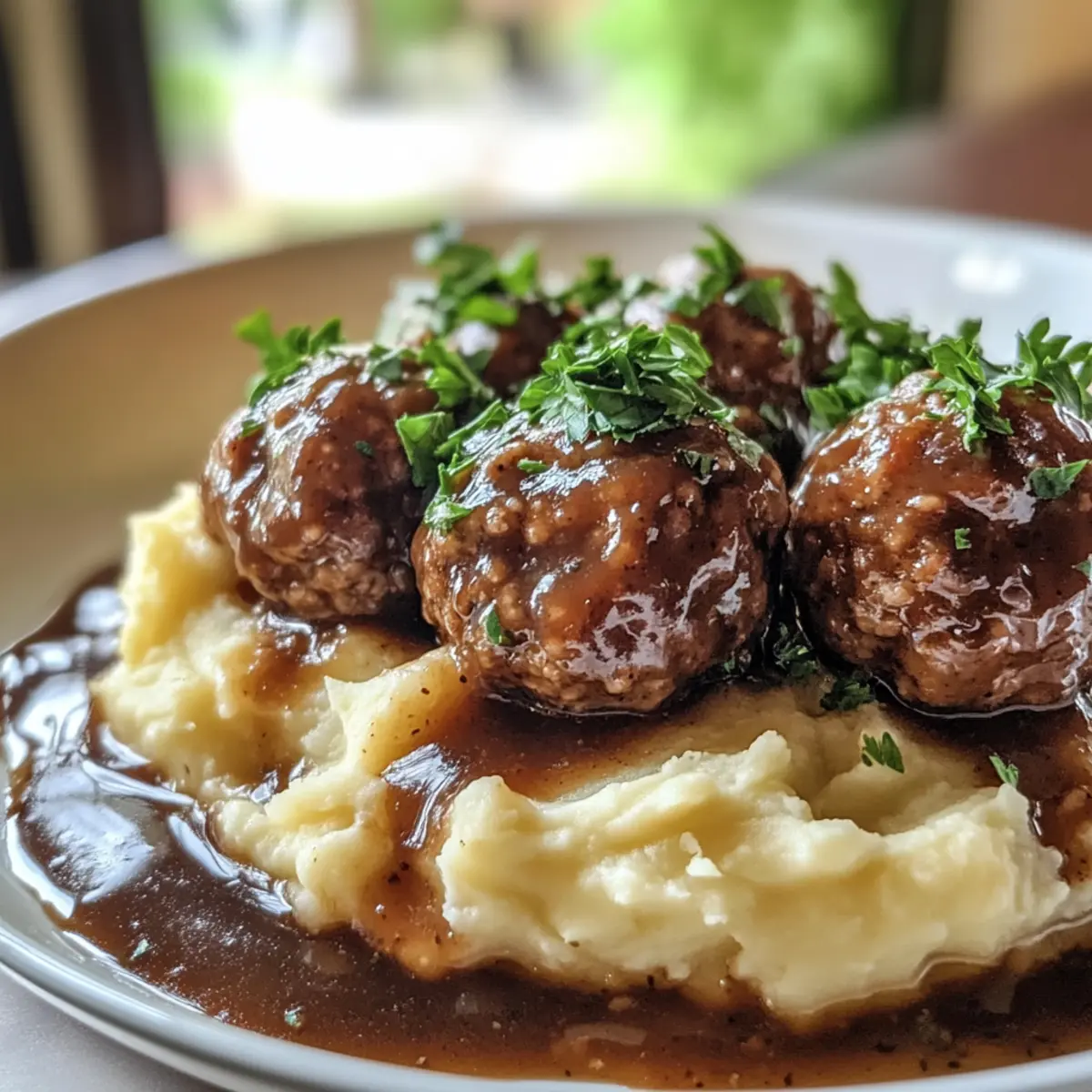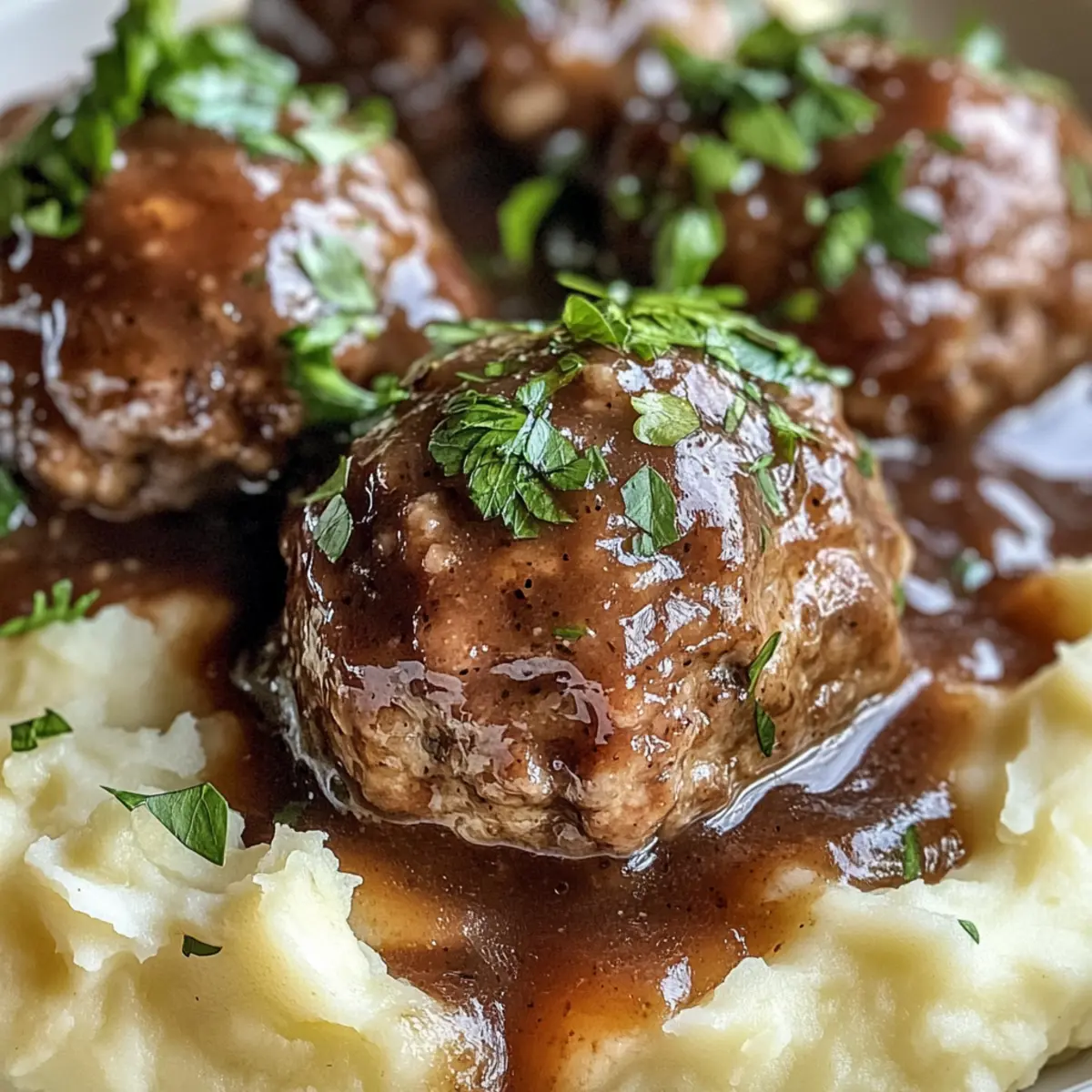 Savor Salisbury Steak Meatballs with Garlic Herb Mashed Potatoes
