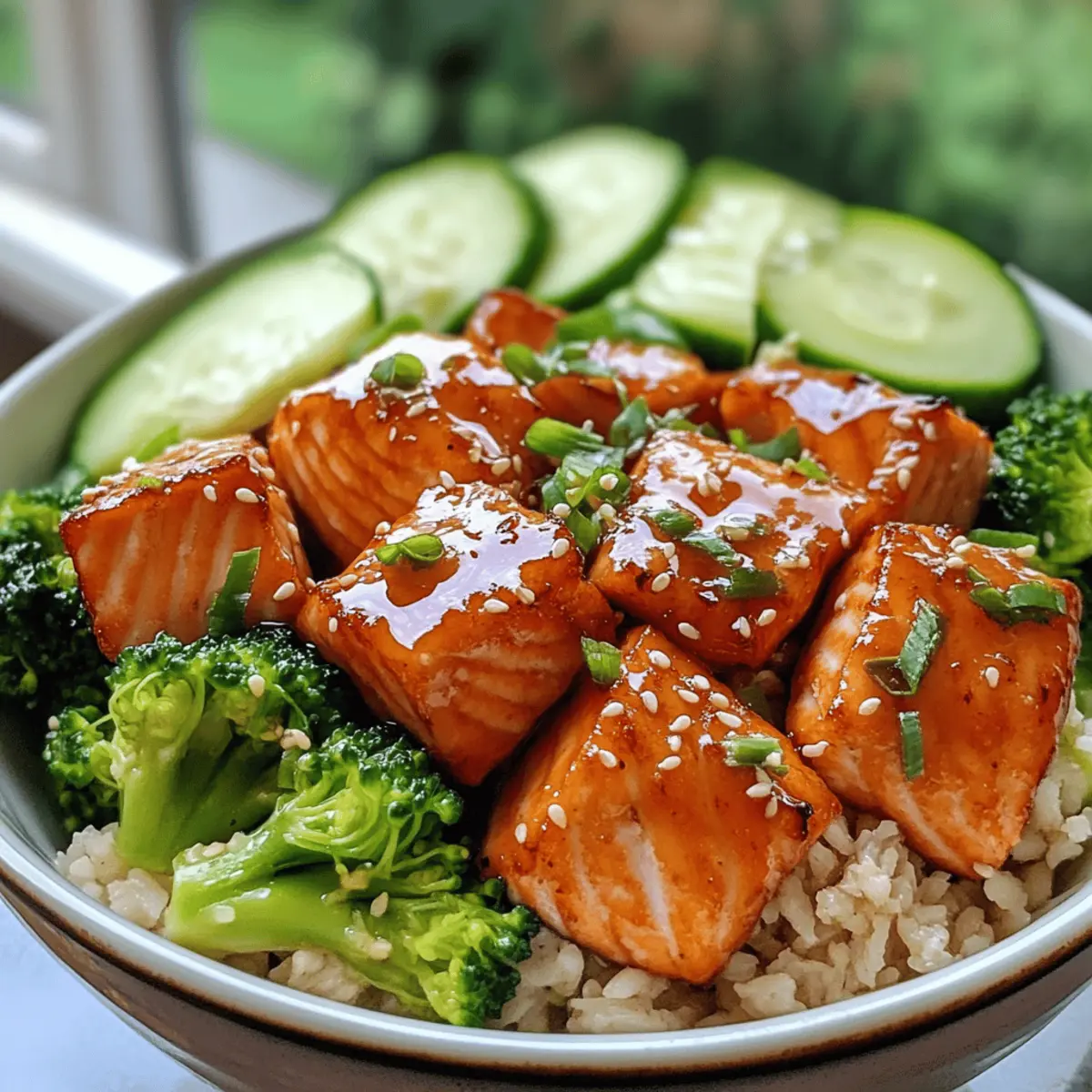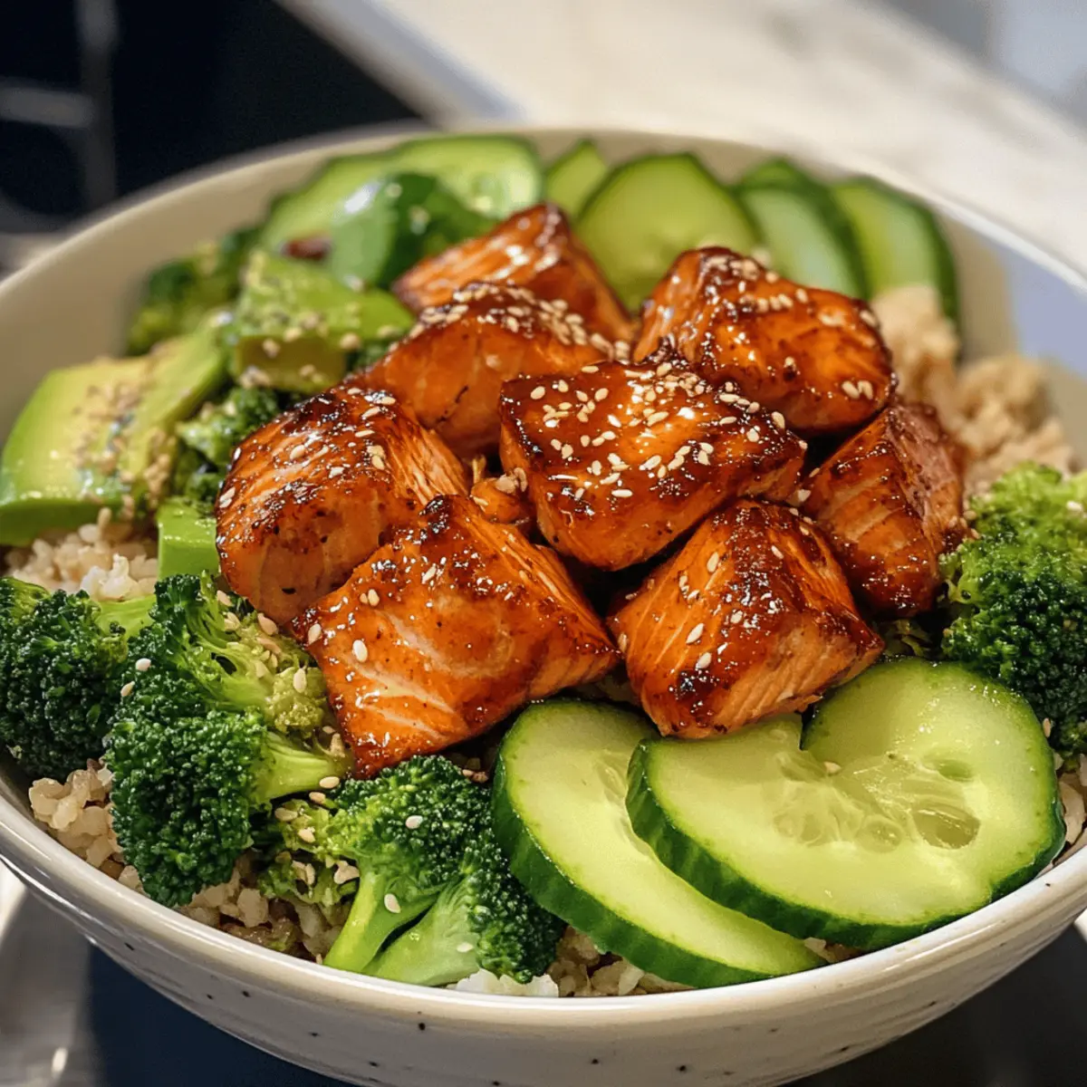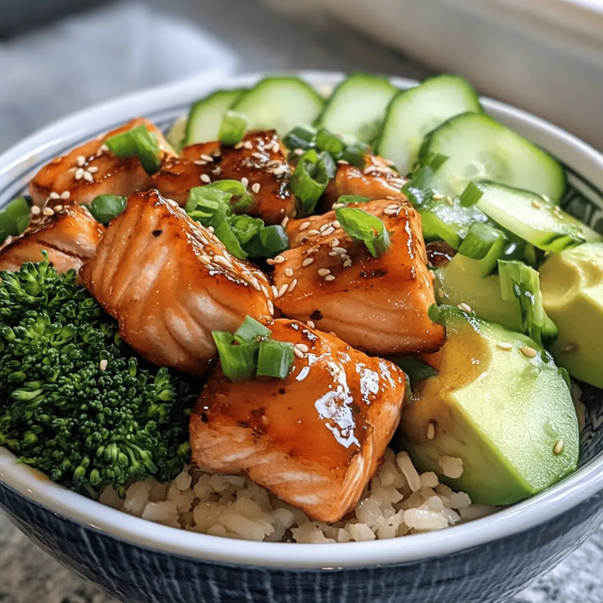 - Assemble the bowls with rice, cucumber salad, broccoli, avocado, and glazed salmon.