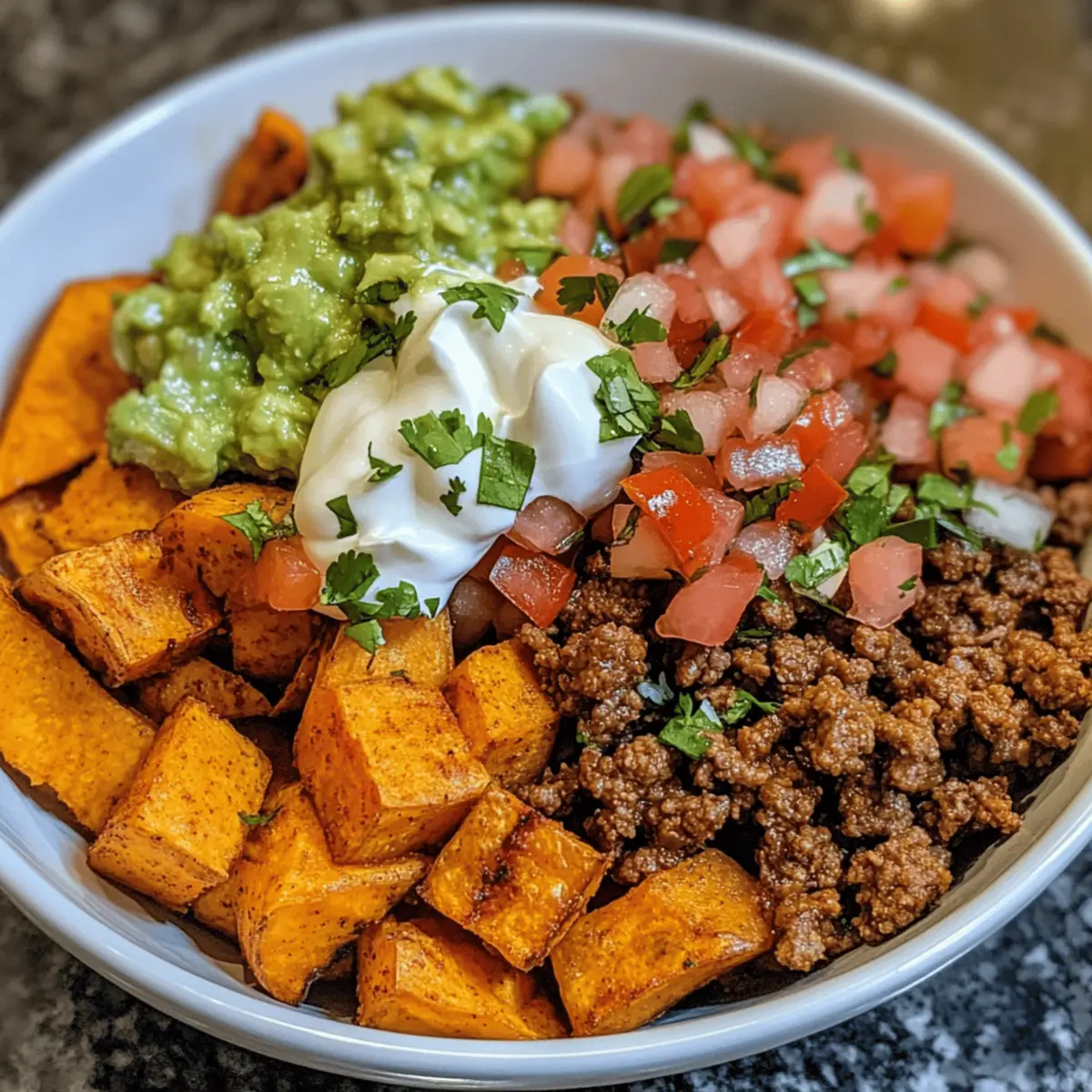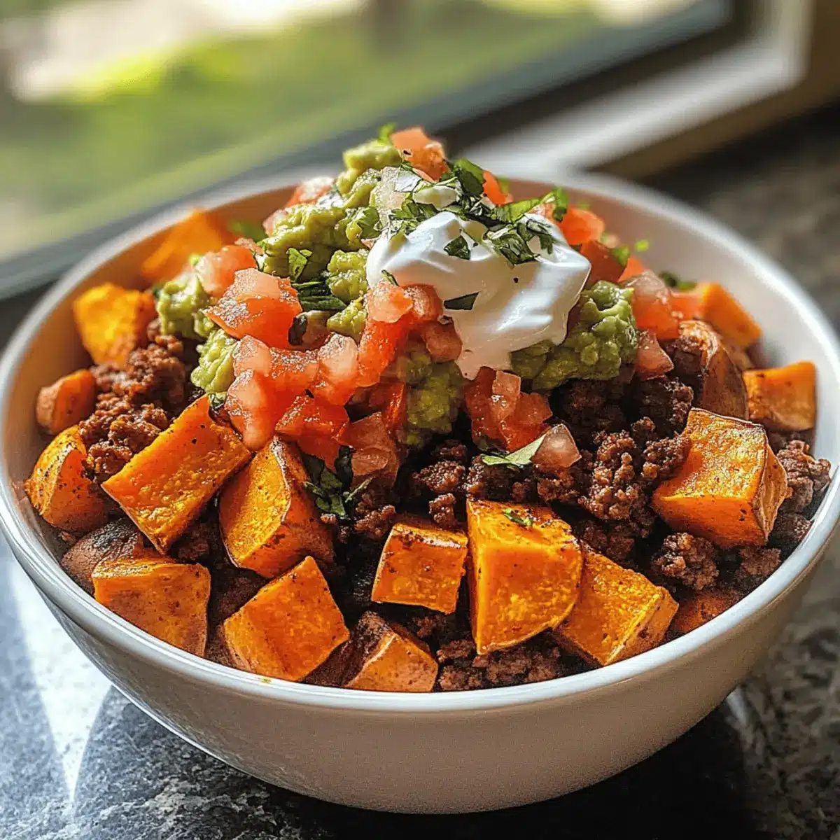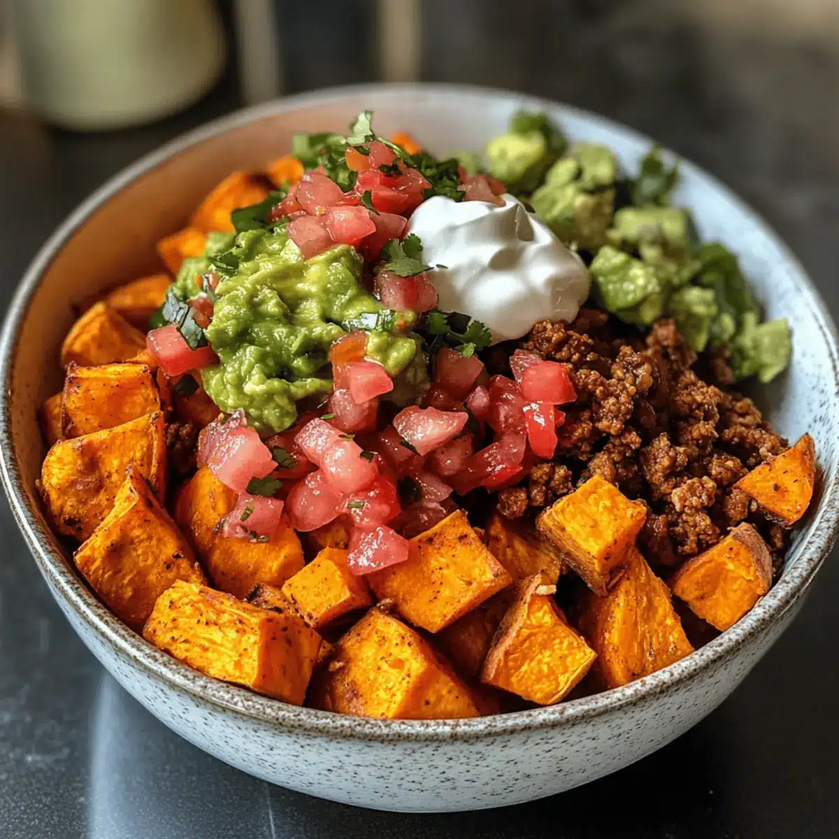 Once everything is cooked, it’s time to assemble your Sweet Potato Taco Bowl! Start with a generous base of roasted sweet potatoes at the bottom of your bowl. Layer on the seasoned ground beef, followed by a heaping scoop of fresh pico de gallo, a dollop of guacamole, and a swirl of sour cream for richness.