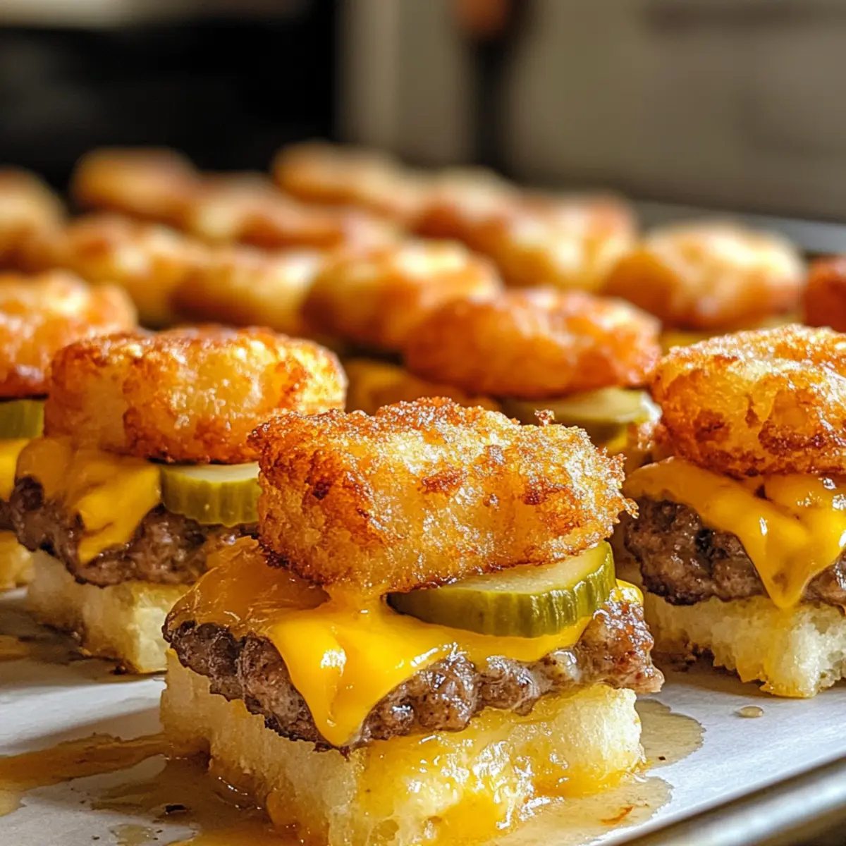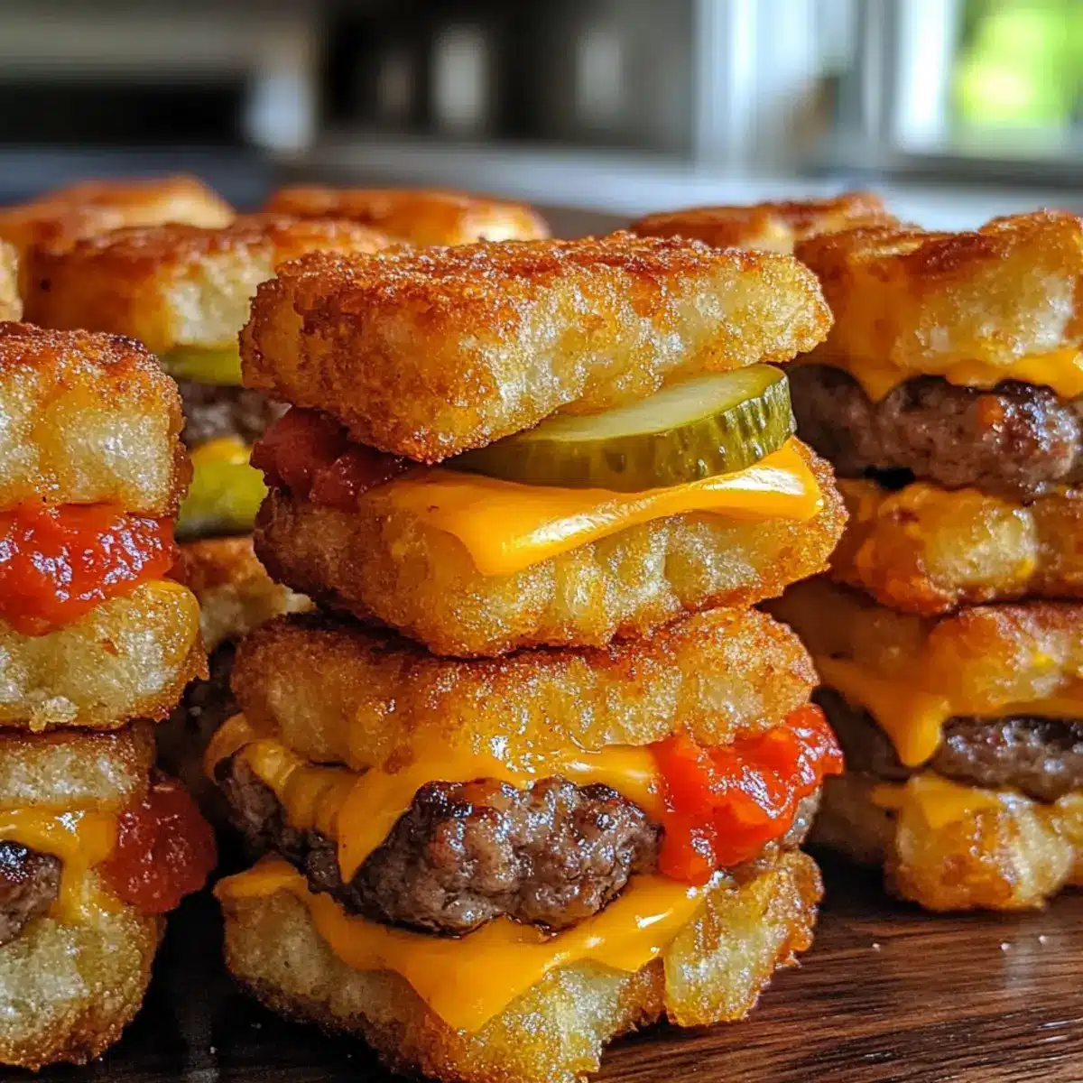 Assemble Wisely: Layering is key! Start with a crispy tater tot, add the sauce, then the beef patty topped with cheese and pickles, finishing with another tot to create balanced flavor and texture.
