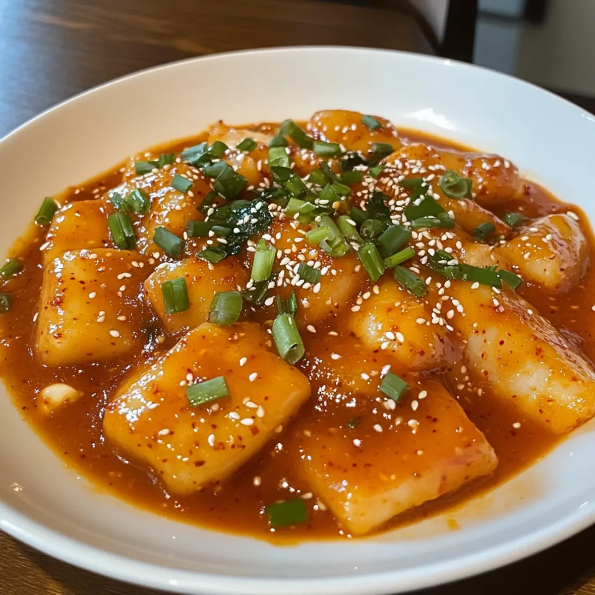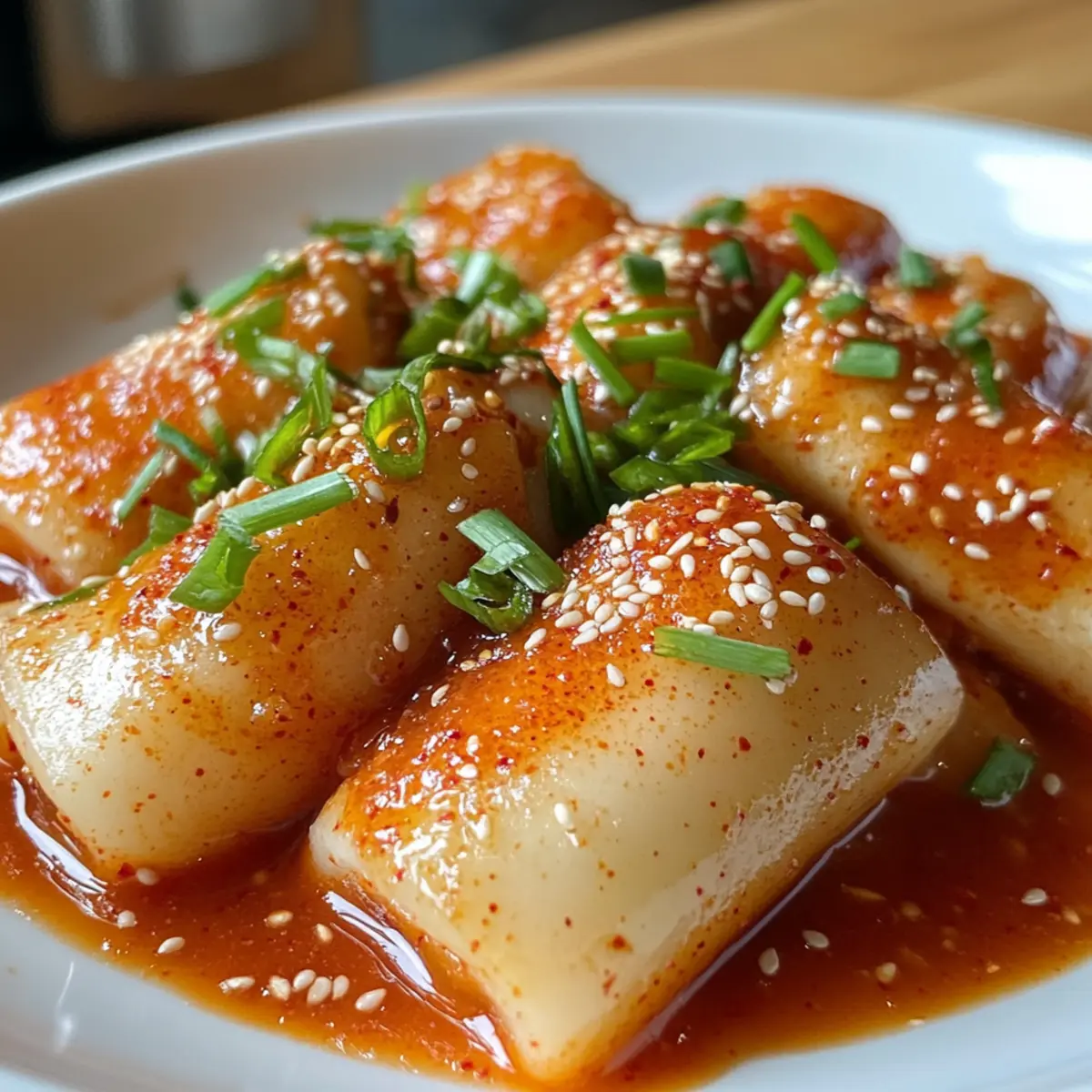 Once the fish cakes are heated through, remove the pot from the heat. Mix in 1 tablespoon of toasted sesame oil and sprinkle in finely chopped scallions for a fresh twist. Carefully transfer the tteokbokki into serving bowls, garnishing each with a sprinkle of sesame seeds. The glossy, red sauce should coat the chewy rice cakes and fish cakes beautifully, ready to be enjoyed!