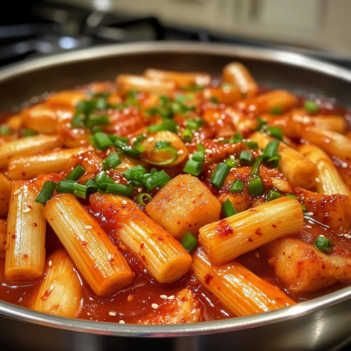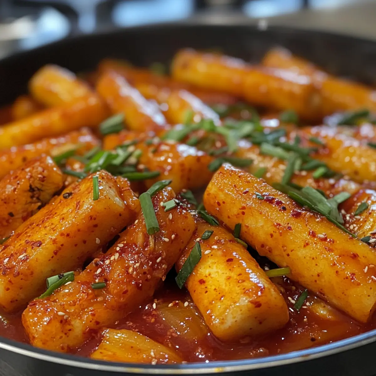 - Remove from heat and drizzle toasted sesame oil over the Tteokbokki. Fold in chopped scallions.