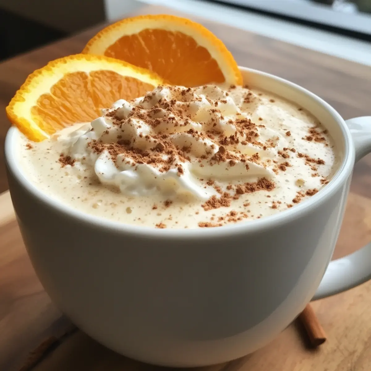 Pour the luscious mixture into a mug. Garnish generously with whipped cream, a sprinkle of cinnamon, orange zest, and a cheeky orange wedge for a delightful touch. Serve warm and cherish the cozy vibes of your White Chocolate Orange Almond Cocoa, perfect for any chilly evening!