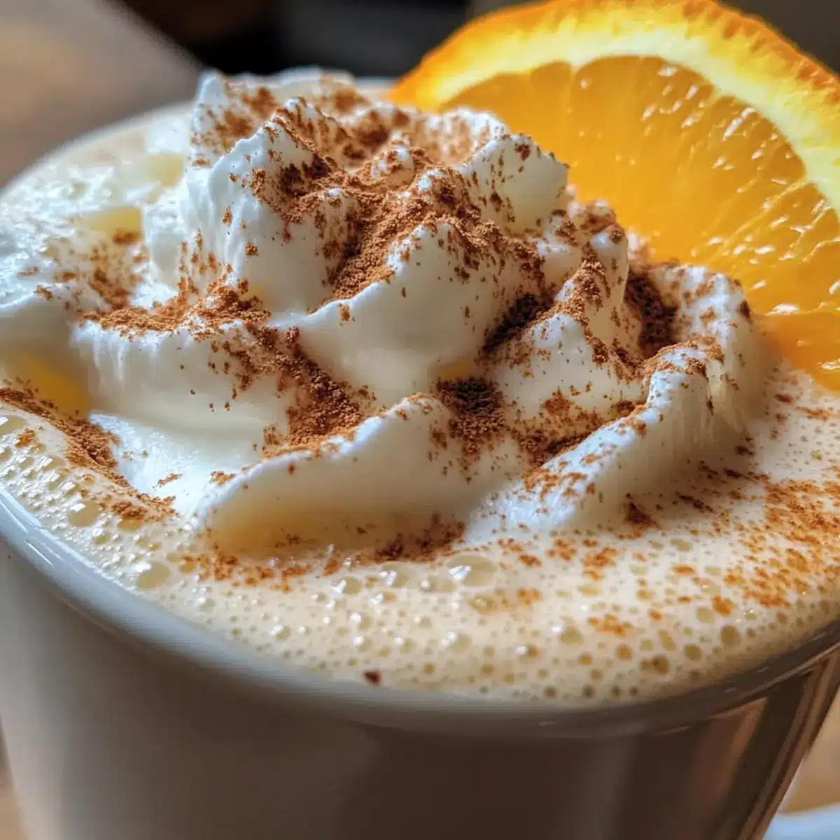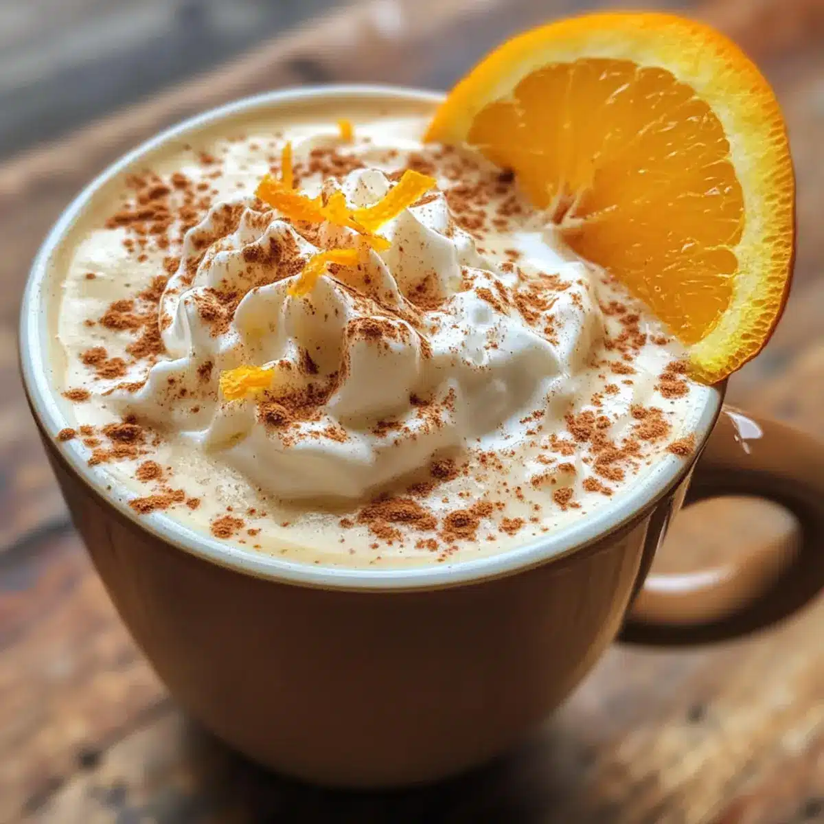 - Serve in a mug, garnished with whipped cream, cinnamon, orange zest, and an orange wedge.
