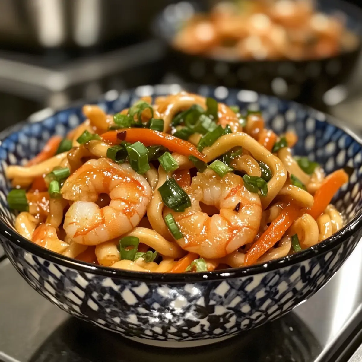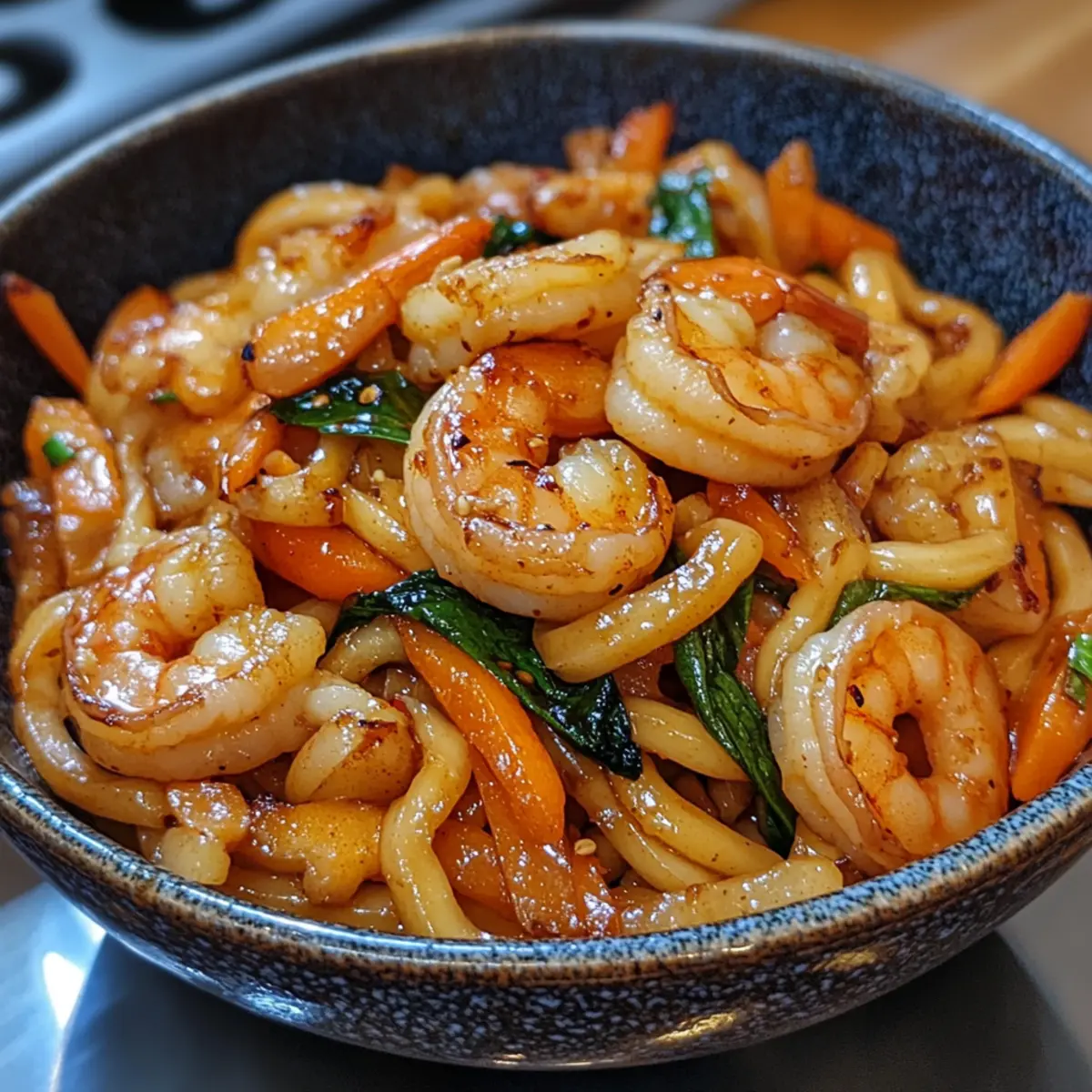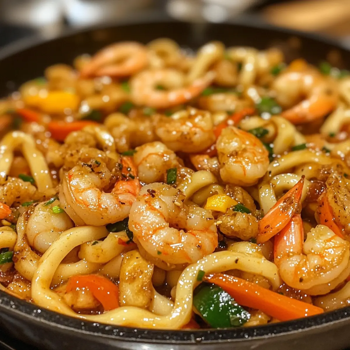 - Combine Noodles and Shrimp: Add cooked udon to the pan, tossing with shrimp over high heat for 1–2 minutes until flavors blend.
