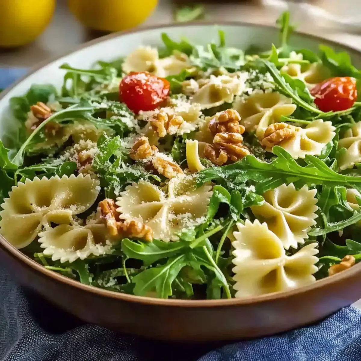 - Add the cooled pasta to the dressing and toss well. Gently fold in the grated Parmesan cheese, toasted walnuts, halved cherry tomatoes, and basil leaves.